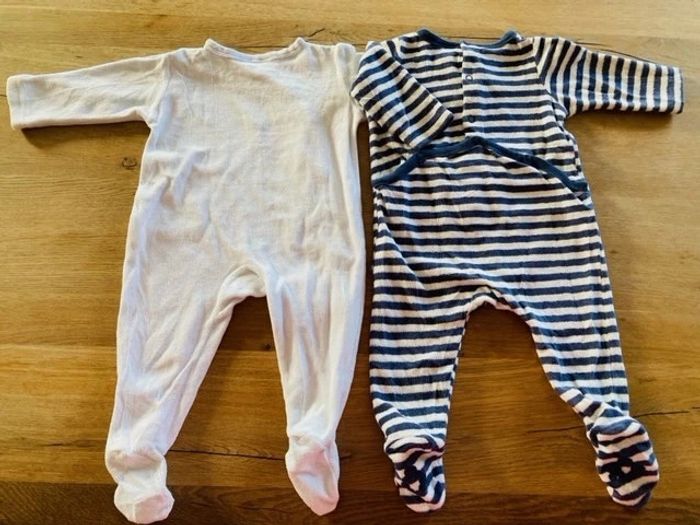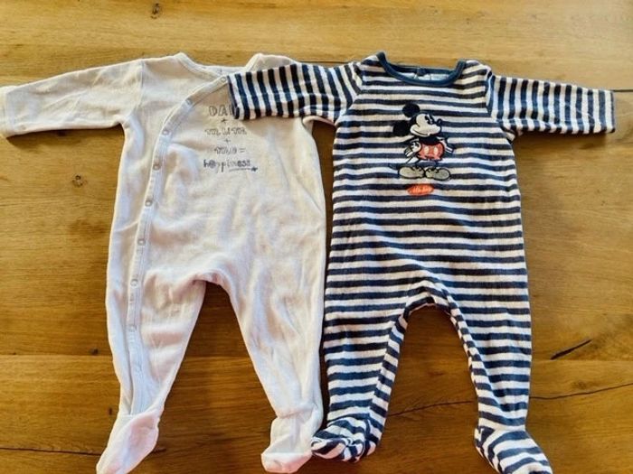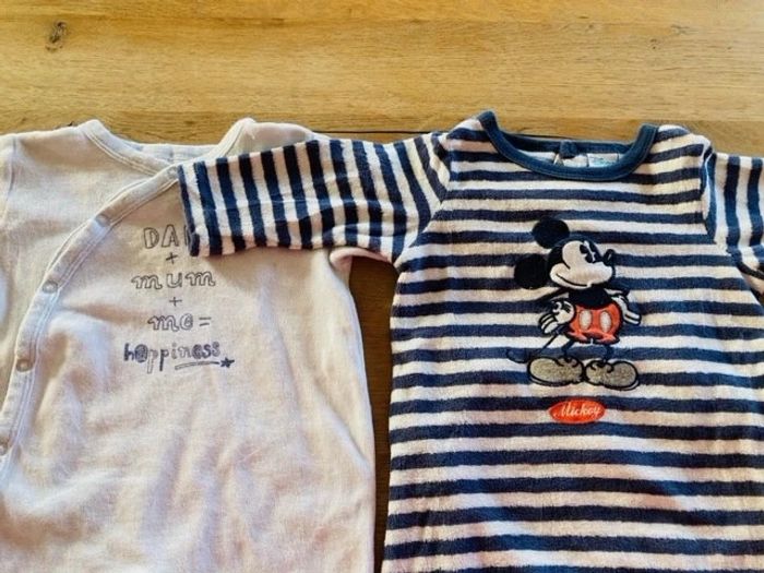 Lot de 2 pyjamas velours un Mickey rayé bleu marine et blanc fermeture par pressions à l’arrière et un autre bleu clair avec fermeture par pressions à l’arrière. Très bon état Taille 6 mois Maison non-fumeur Envoi rapide et soigné