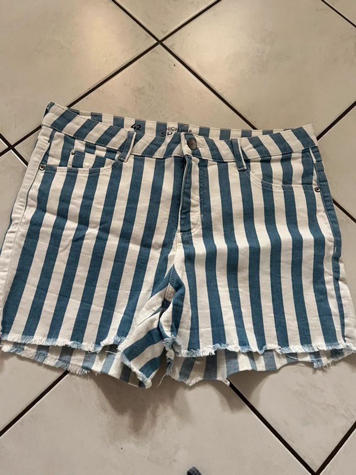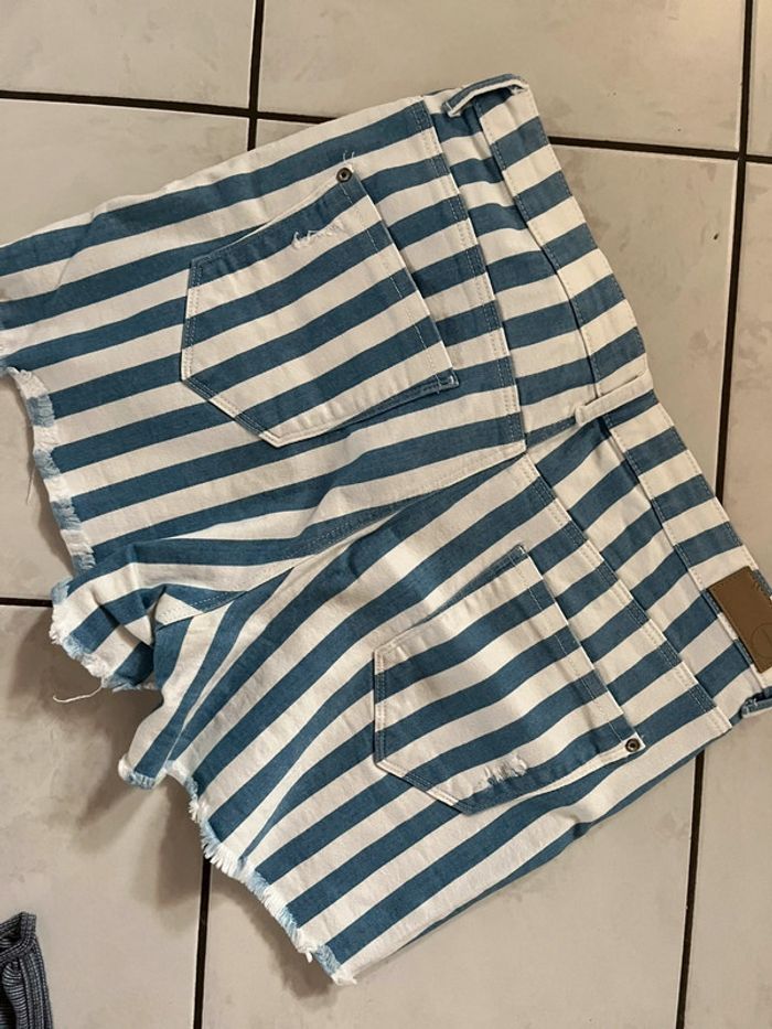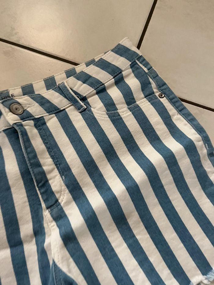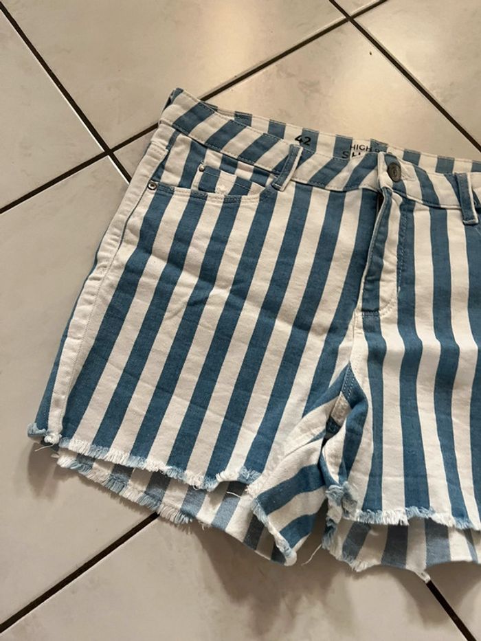 #short #jeans #raye #blanc #bleu #bouton #tirette #poches #taille42 #highrise #c&a