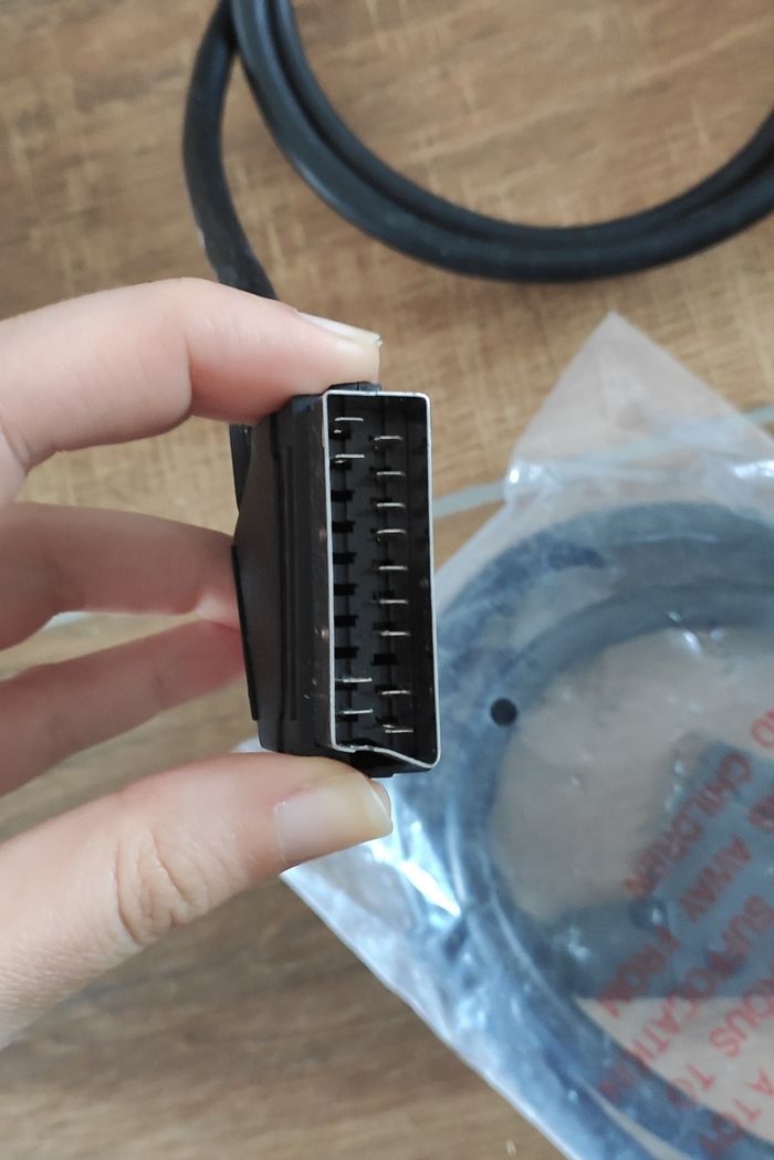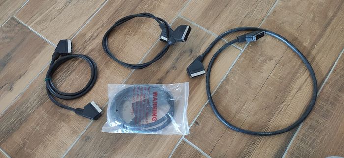 Je vends ce lot de 4 câbles péritel en bon état. Ils sont noirs et mesurent environ 1,5 mètres de long chacun. Ils sont parfaits pour connecter des appareils audio-vidéo comme des téléviseurs, décodeurs ou consoles de jeux. Ils permettent de transmettre le signal vidéo et audio entre ces équipements. C'est un ensemble pratique et fonctionnel qui peut être très utile pour de nombreuses installations.