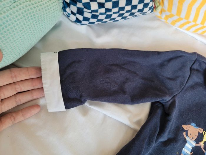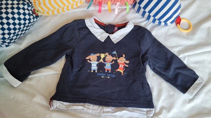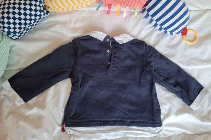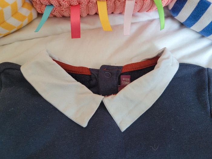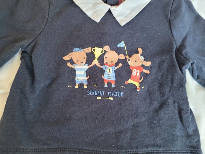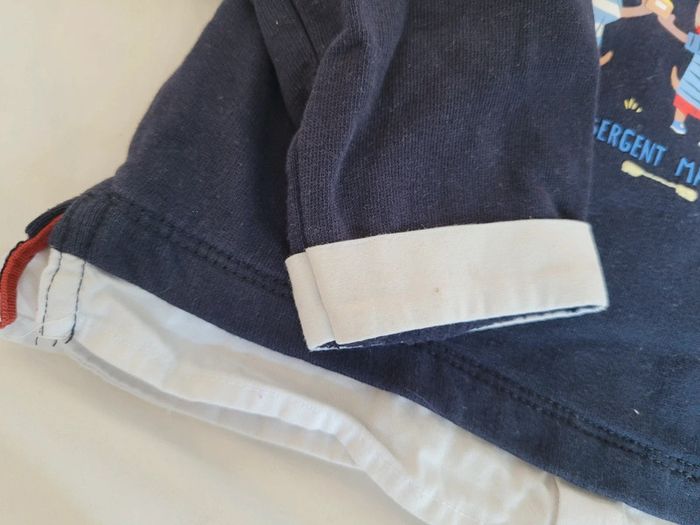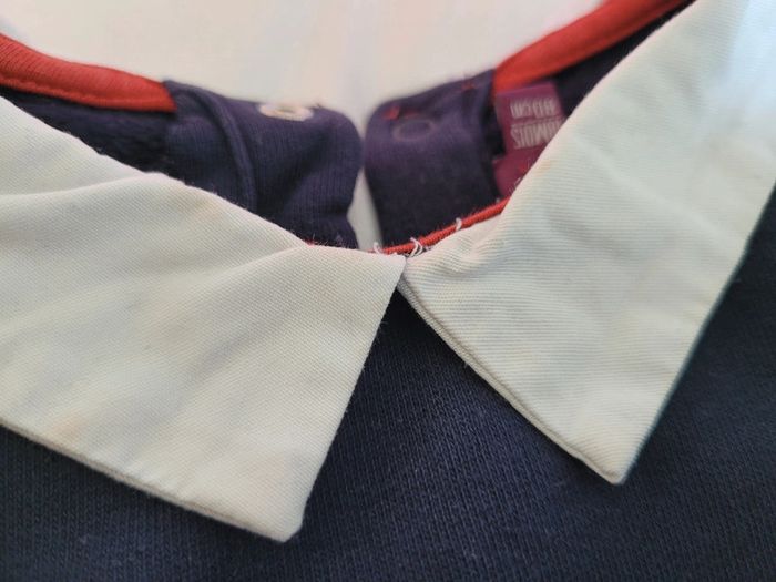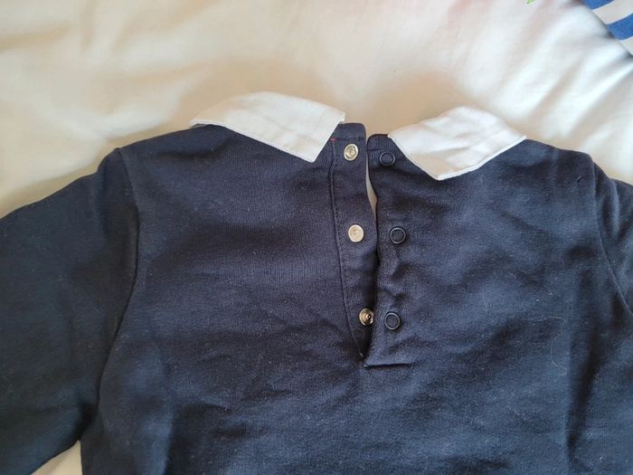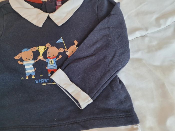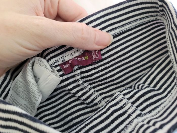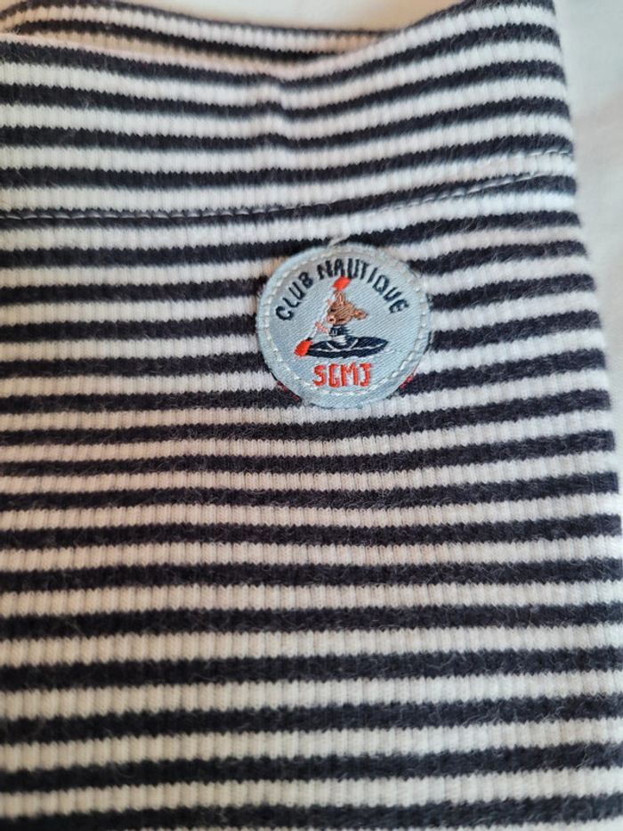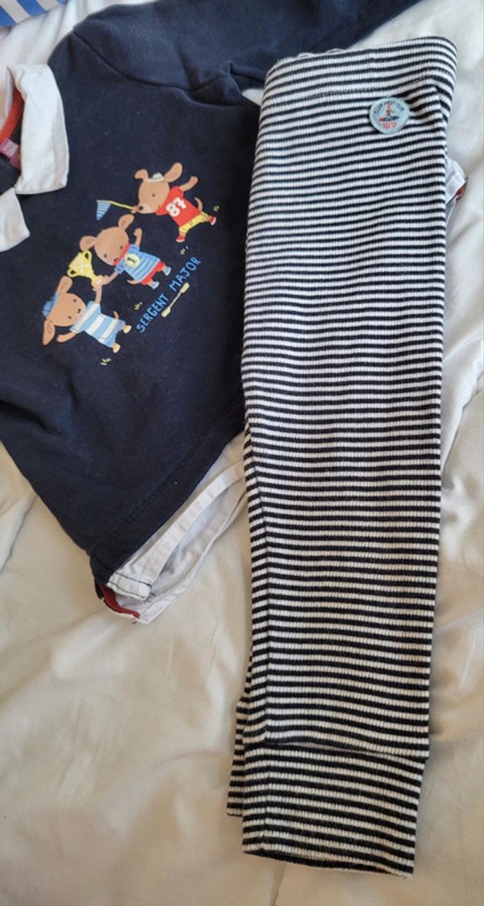 👘 Très joli ensemble de la marque Sergent Major. Taille 18 mois correctement. 80 cm. Idéal mi-saison et pour les soirs d'été. 🧥 Pull sweat avec effet "fausse chemise" , couleurs bleu marine et blanc. Motif tbe. Manches longues, col et 3 boutons pressions derrière pour enfiler plus facilement. 🧷 Une mini tâche sur le bout d'une manche et au niveau du col (elle ne se voit quasiment pas avec le col replié). Voir les photos. 👖un legging stretch rayé noir et blanc. Très stretch, très souple. Écusson club nautique sgmj. Ensemble en très bon état. Acheté neuf en 2024 et porté par un seul bébé. #T18_24mois_baptlily