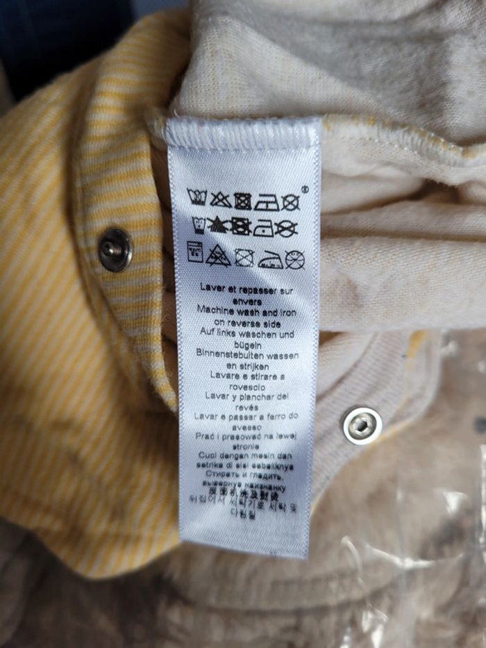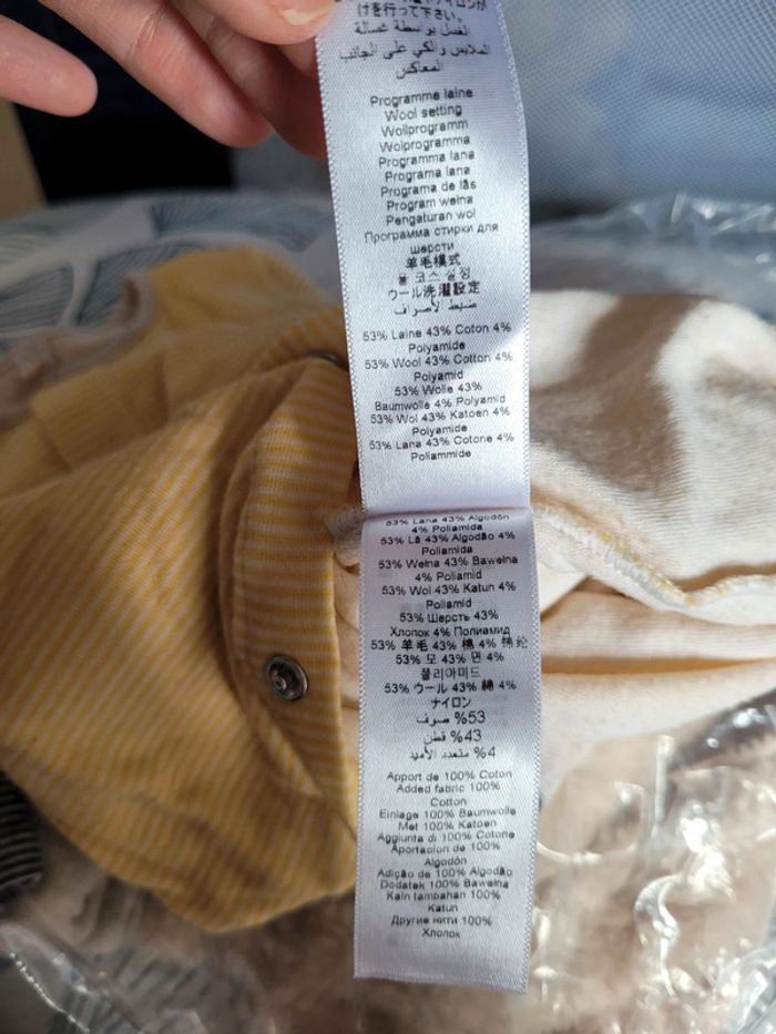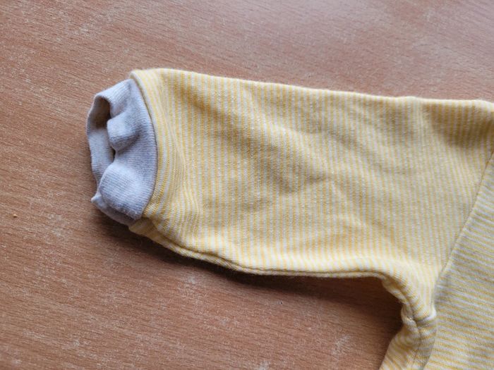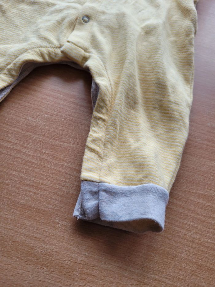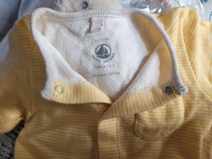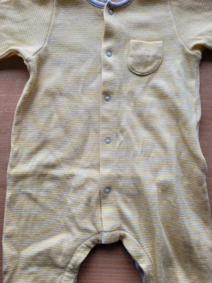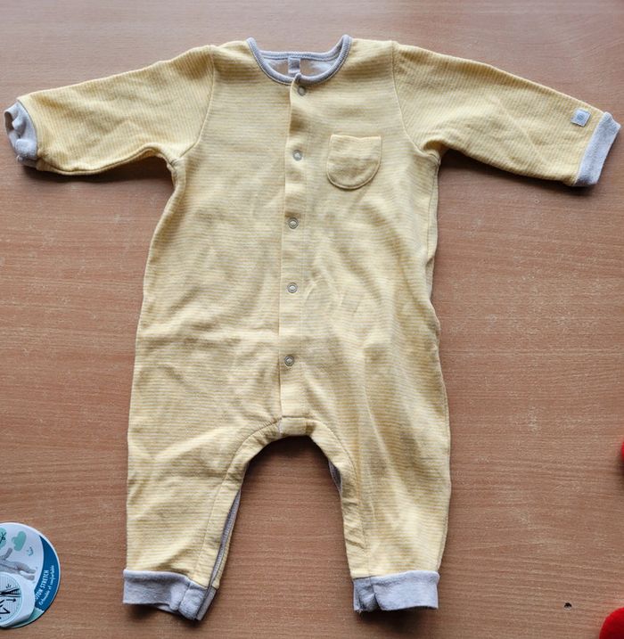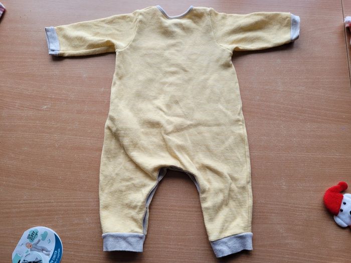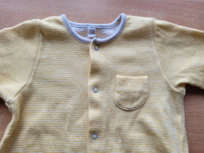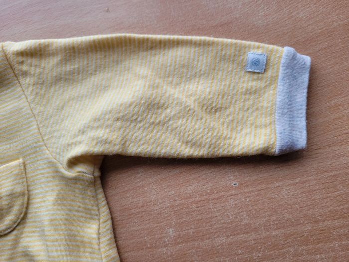 Combinaison longue mixte, taille 6 mois Petit Bateau. Sans pieds, à manches longues. Rayée jaune et blanc. Laine, coton biologique et polyamide. La combinaison est très douce. Elle peut également servir de pyjama, style combinaison jour et nuit. Ouverture pressionnee sur le devant et à l'entrejambe, très pratique. Petite pochette plaquée sur la poitrine. Bas.de.manches et de jambes contrastés (gris/beige). Achetée neuve. Portée par un seul bébé. Toujours en vente sur le site. #T6_9mois_baptlily