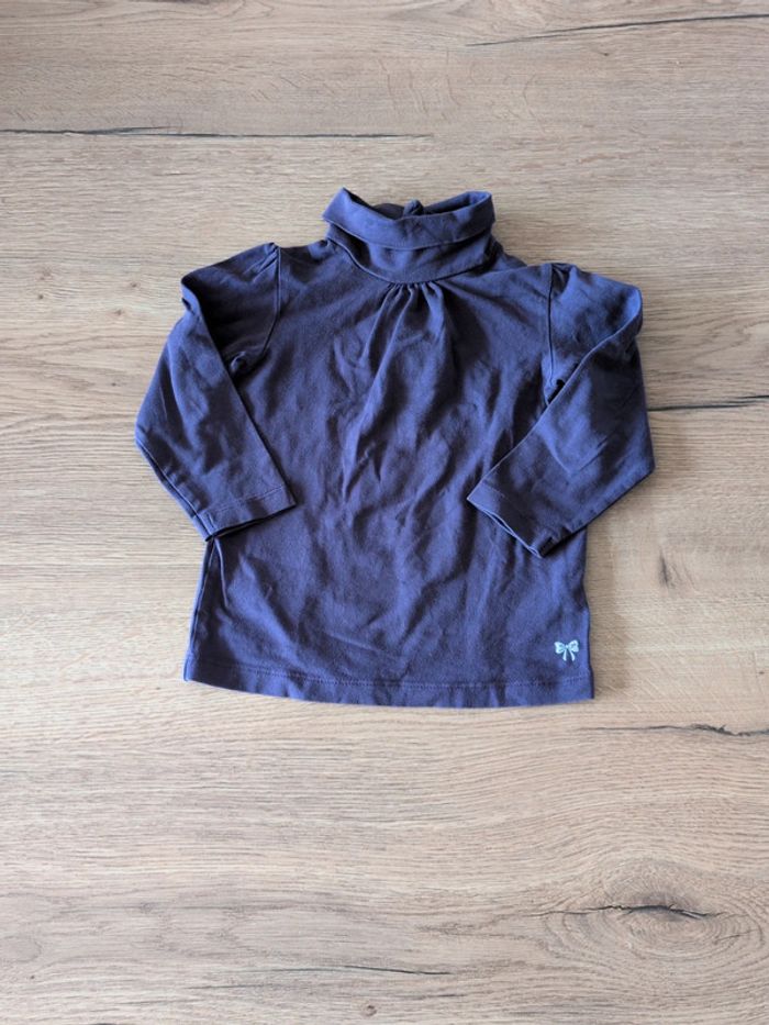 T-shirt à manche longue violet avec un col à roulé et des boutons à pression à l'arrière.