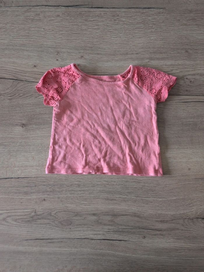 T-shirt manche court brodé rose, la couleur est un peu délavée.