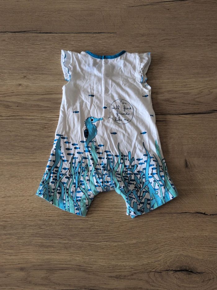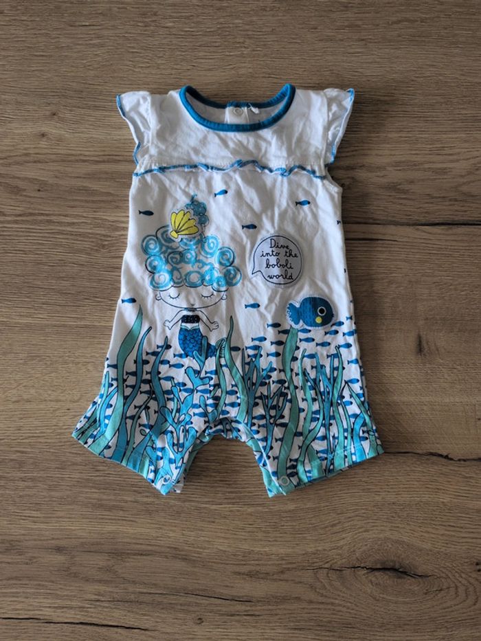 Adorable combishort de la marque Boboli, taille 12 mois. Motif marin avec une jolie sirène, petits poissons et algues dans les tons bleu et turquoise. Inscription "Dive into the books world" sur le devant. Tissu léger et confortable, parfait pour l'été. Boutons-pression à l'entrejambe pour faciliter le change et des boutons pression à l'arrière. #boboli #combishort #bébéfille #12mois #étébébé #vêtementbébé #vetementfille #bébéété #modebébé #combishortbébé #secondeMain #bonétat #vintedkids #petitefille