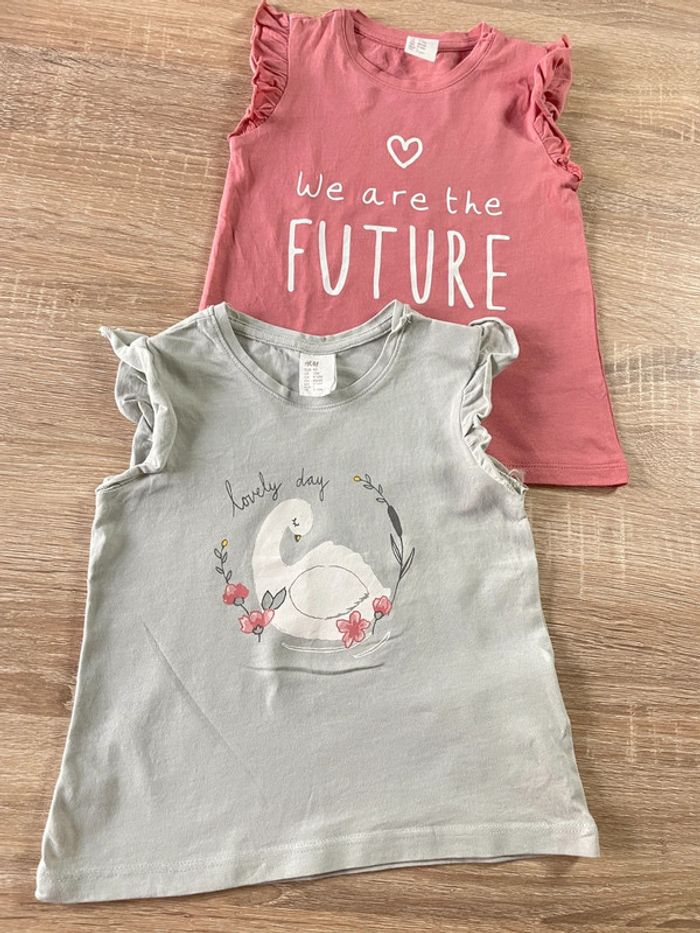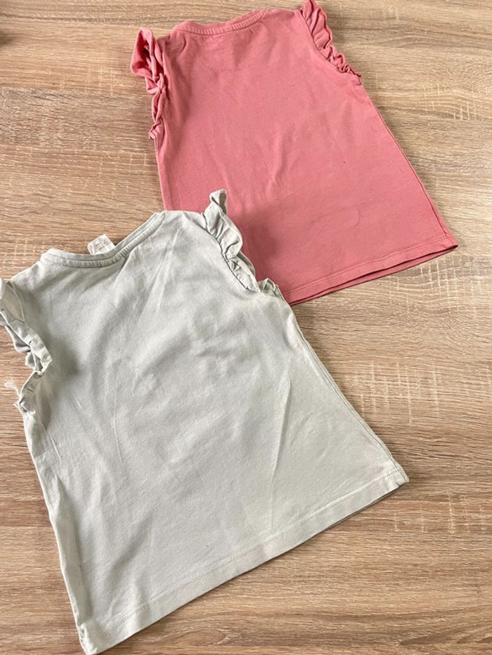 T-shirt avec volants épaules, 1 vieux rose inscription blanches et 1 vert d'eau avec dessin cygne