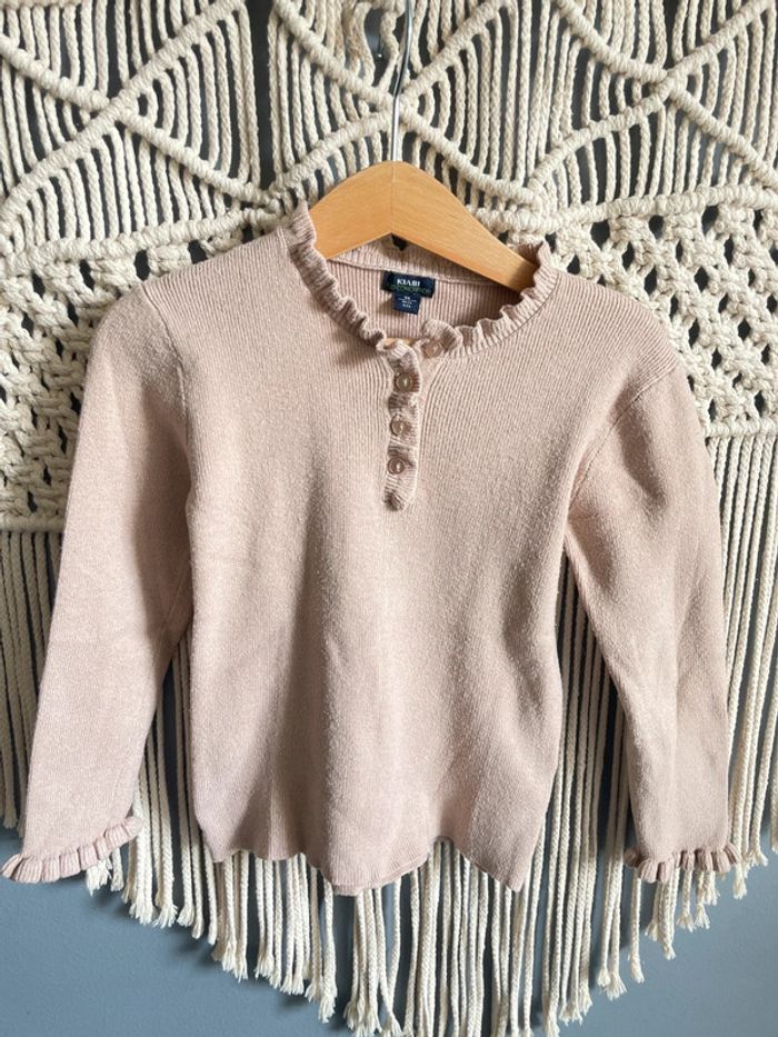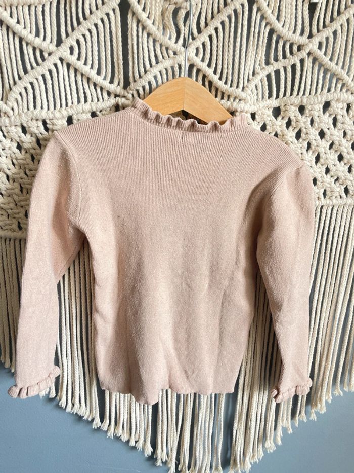 Pull tunisien en maille, col et bord des manches à volants. Étiquette de la matière coupée