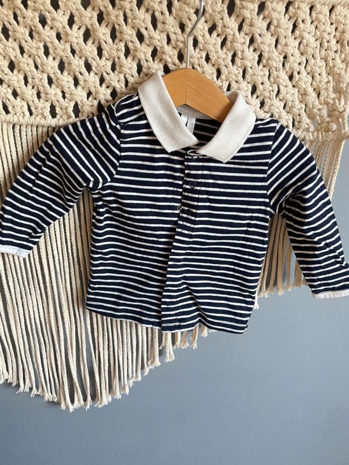 Ensemble composé d’un polo marinière manches longues et d’une salopette en maille doublé. Le polo s’ouvre par pressions à l’avant et la salopette à l’entrejambe.