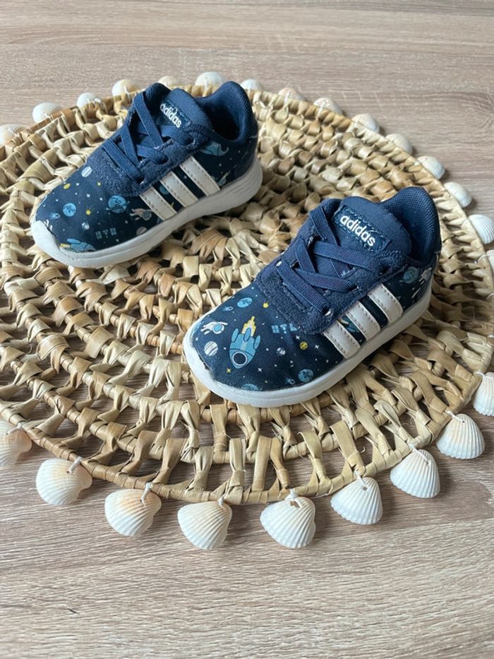 Baskets en tissus imprimés planètes et fusées, lacets élastiques.