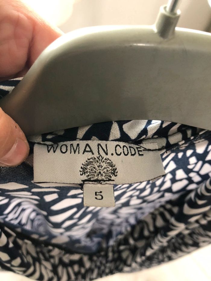 Tunique longue femme Couleur bleue avec motifs blancs Taille 5 Marque woman code Très bon état en polyester