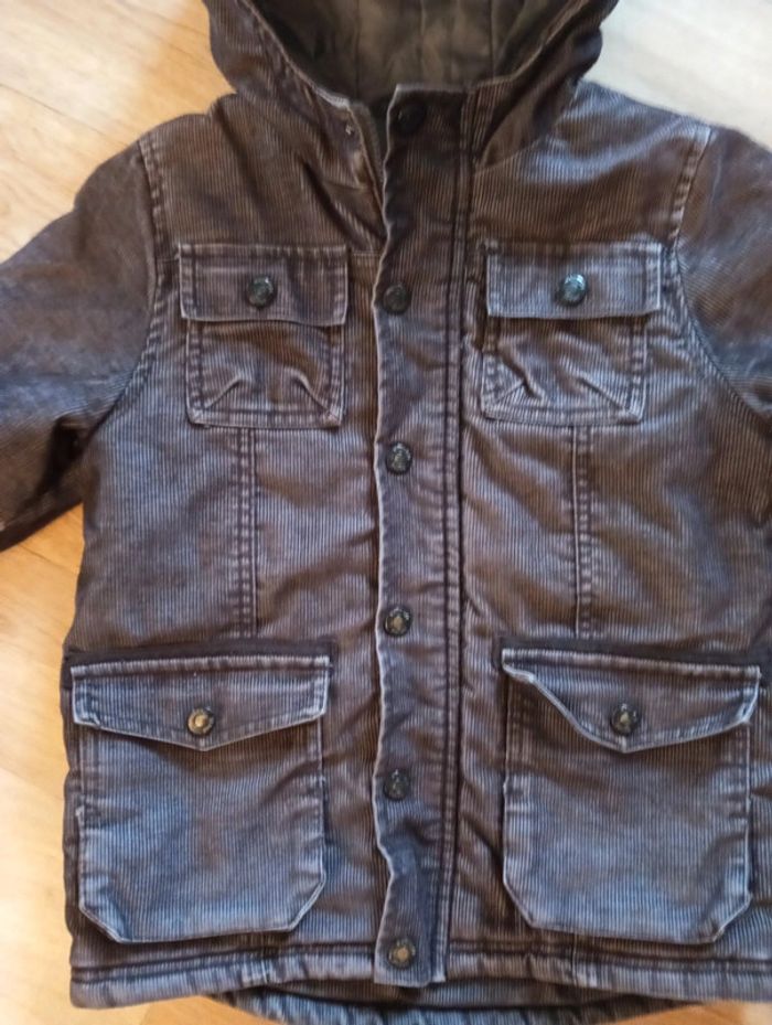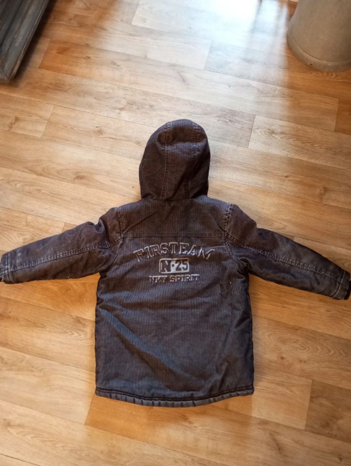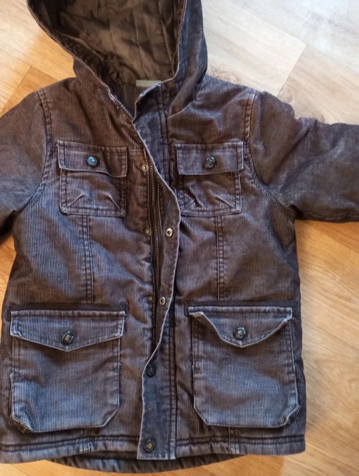 Velour côtelé marron aspect vieilli . Fermeture éclair ne fonctionne plus mais le manteau se ferme avec les pressions. Très bon état général