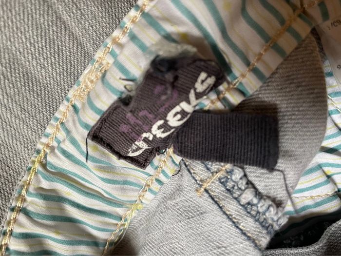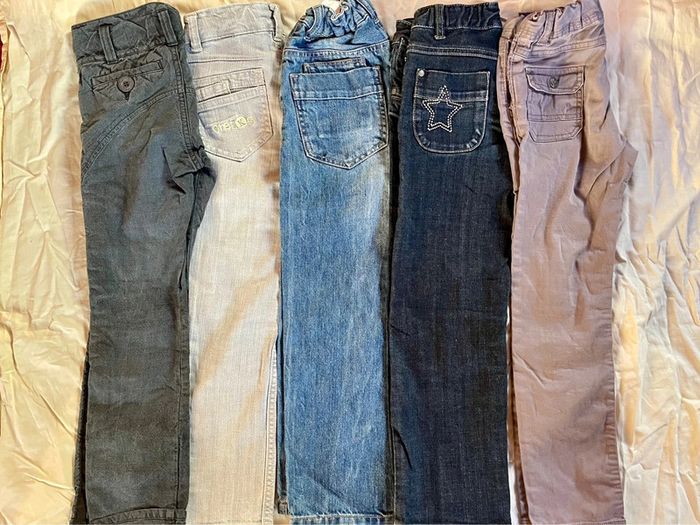TBE général, 3 jeans et 2 pantalons. Le pantalon sur la gauche a des bandes gris foncés sur les côtés.