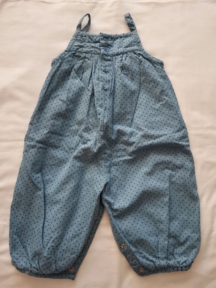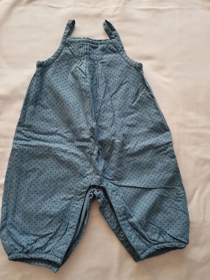 Ensemble ou combinaison bout'chou en 6 mois. Sans manches, doublé. Bleu à pois. Ouverture à l'entrejambe par des pressions et boutons en haut du dos. En très bon état. #emilie77127fille6mois