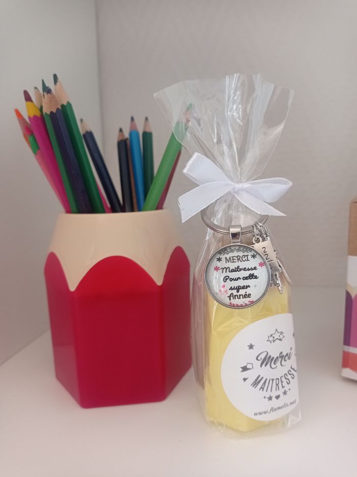 Merci Maîtresse , Atsem!" mais en version stylée ! Fini la trousse et les fleurs vues et revues... Offre un crayon pas comme les autres : un crayon-bougie en cire végétale, parfumé au doux parfum de Grasse, accompagné de son porte-clés trop chou ! Cadeau parfait de fin d’année scolaire pour maîtresse, ATSEM, nounou ou prof préféré ! Et cerise sur le gâteau ajoute une étiquette personnalisé 🙃 Fabriqué avec soin en Alsace, et avec beaucoup d’amour (et un soupçon de magie).
