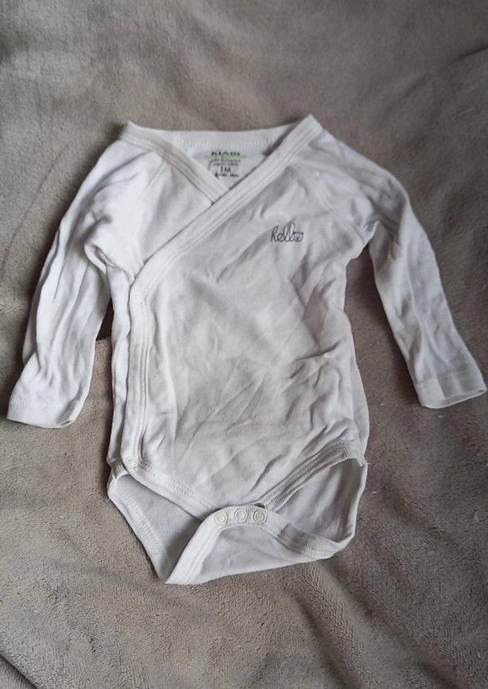 Taille 1 mois, 52-55 cm Inscription "hello", ouverture en cache cœur.