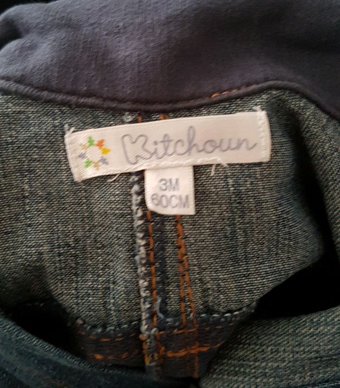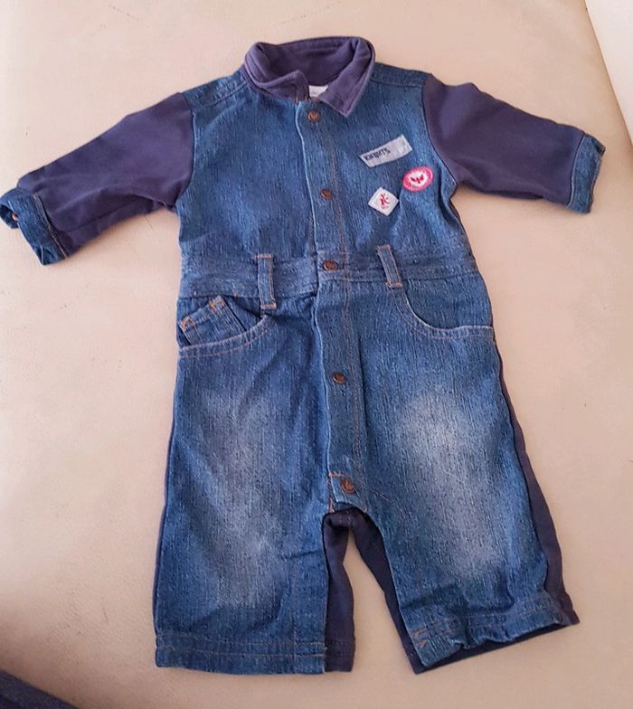 Combinaison de la marque "Kitchoun" en excellent état, taille 3 mois. Tissu 100% coton, fermeture pression sur le devant ainsi qu'aux manches. 3 petits éléments sont brodés sur le devant.