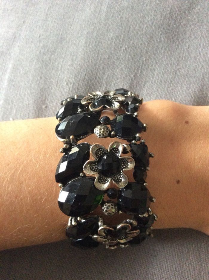 Bonjour, je vends ce bracelet argenté avec des motifs fleurs noires en très bon état !