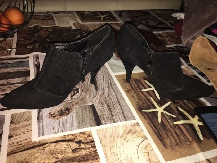 Vends une paire de bottines noires en taille 39, talons de 8 cm, dessus imitation daim. État neuf