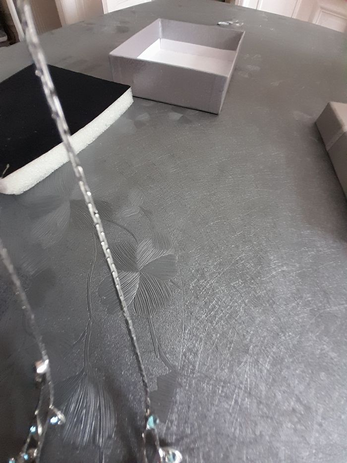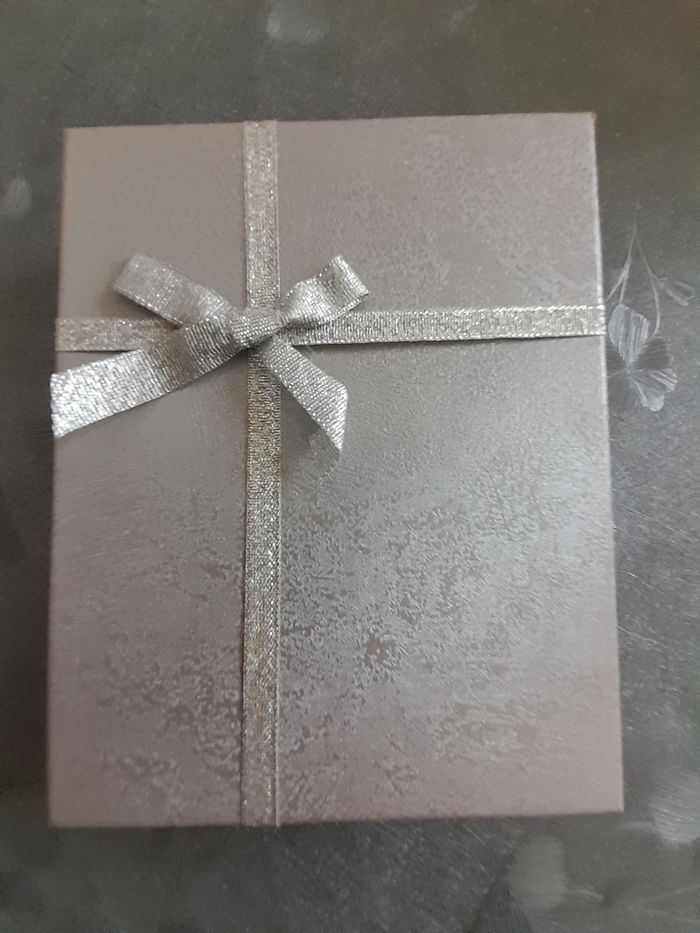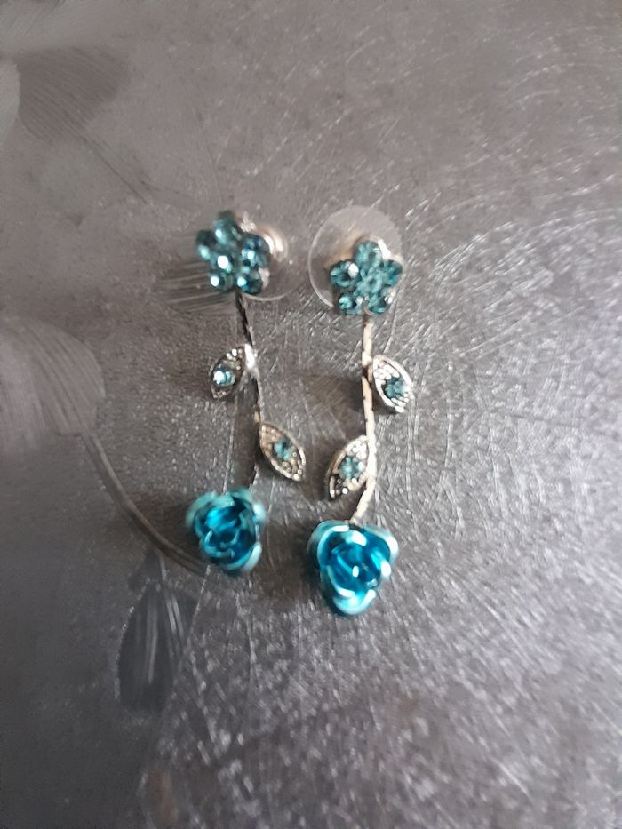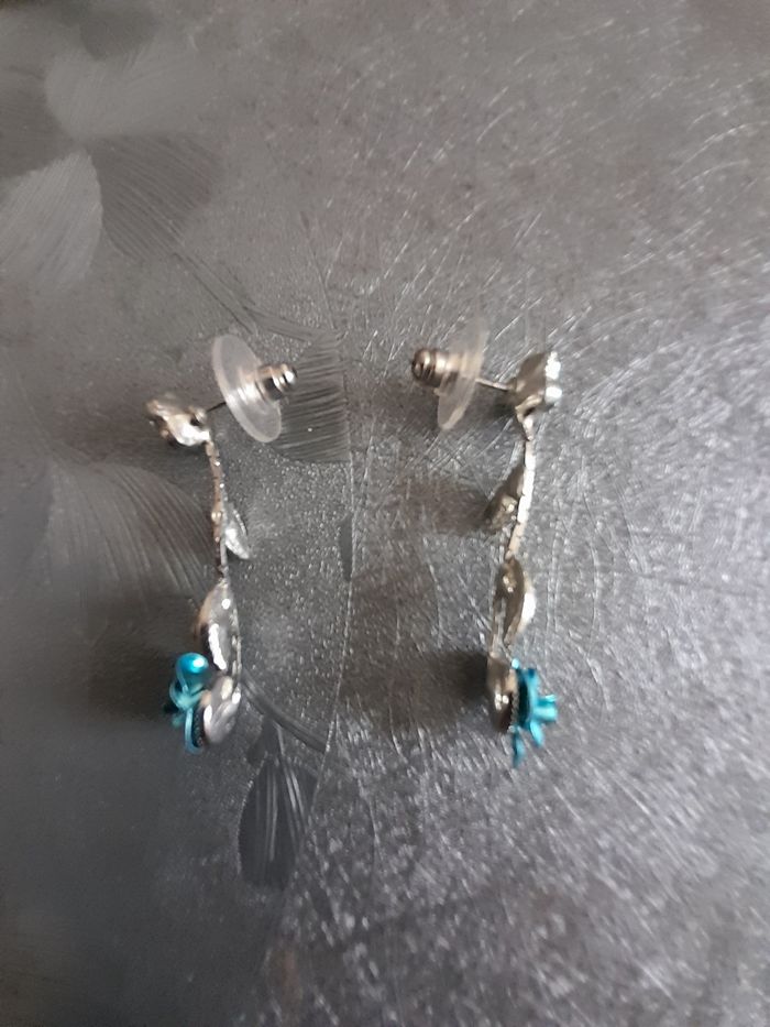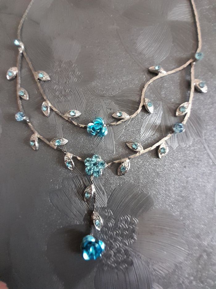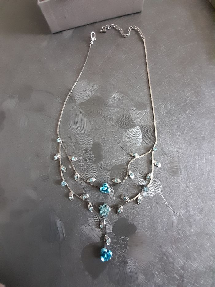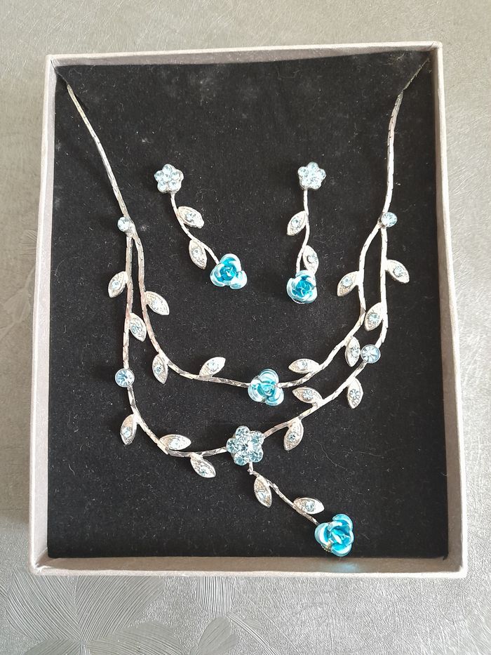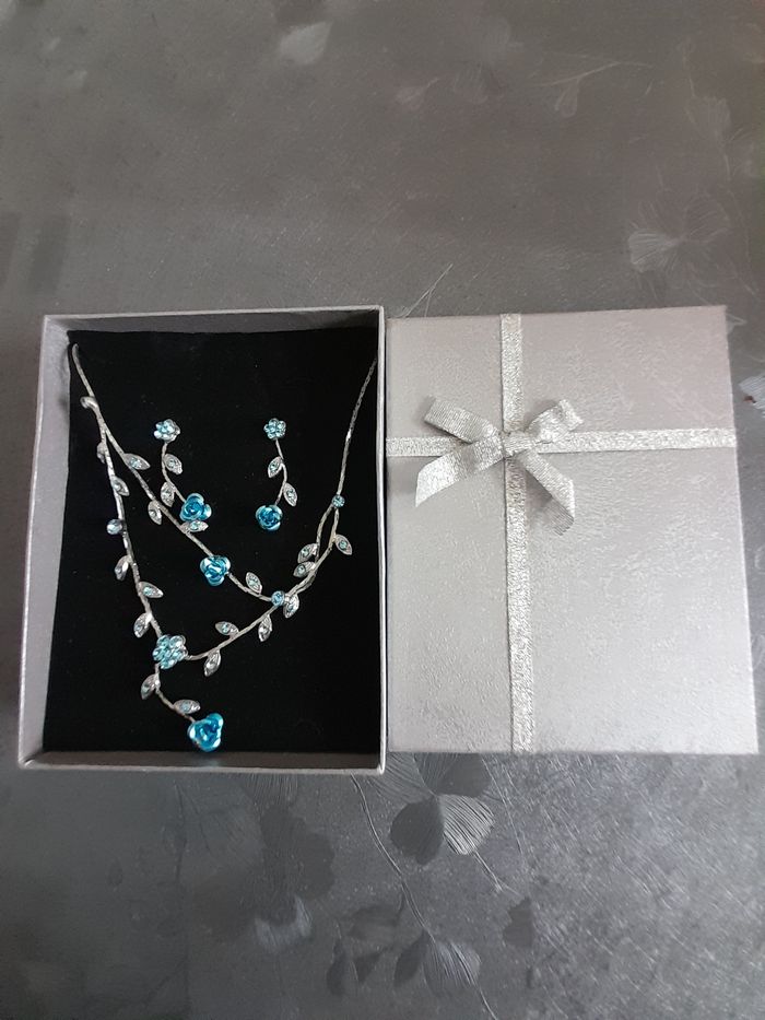 Parure collier + boucle d'oreilles Couleur métal argenté et fleurs bleu Dans son coffret d'origine Neuf jamais porté