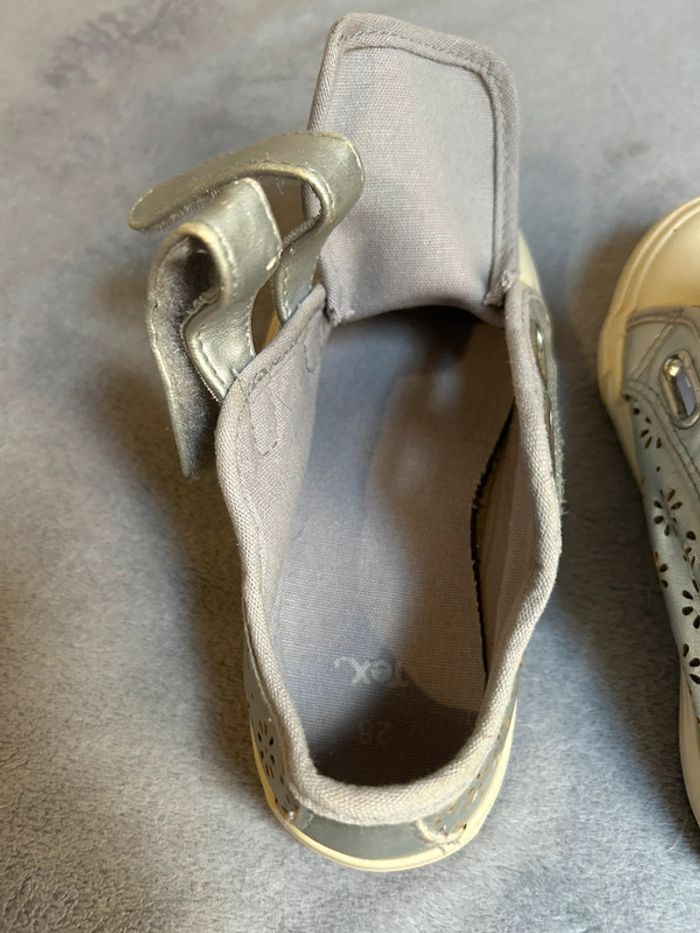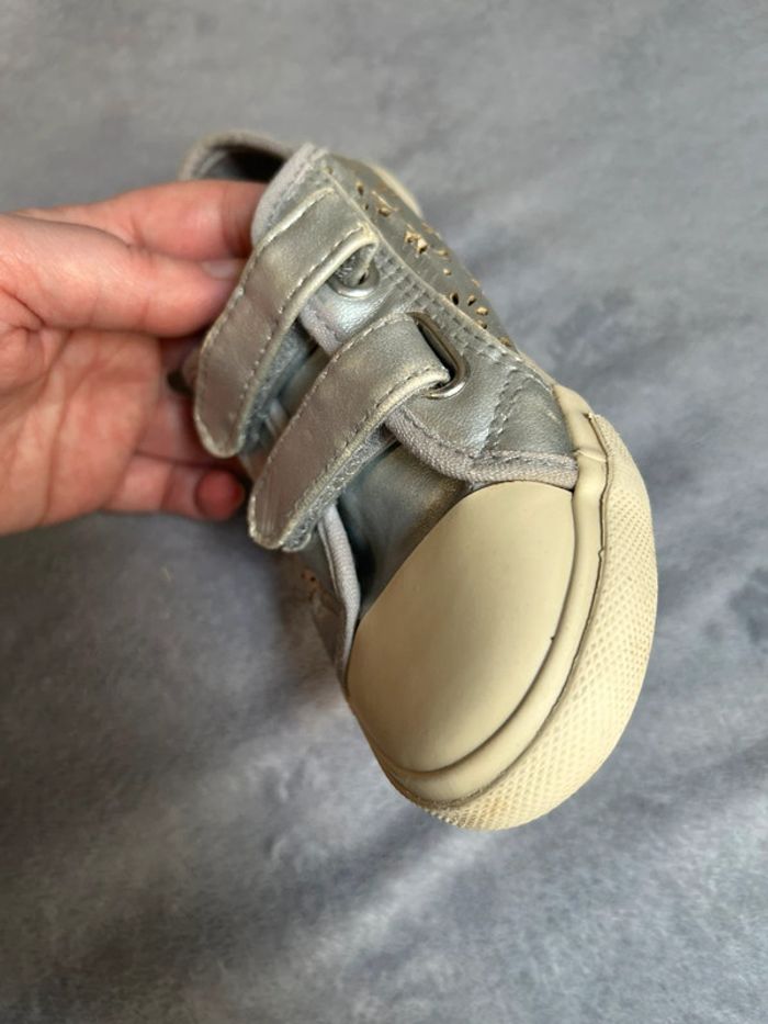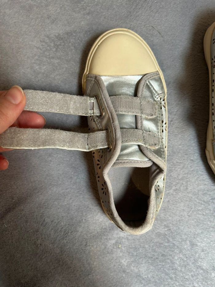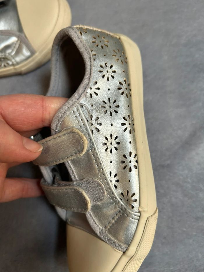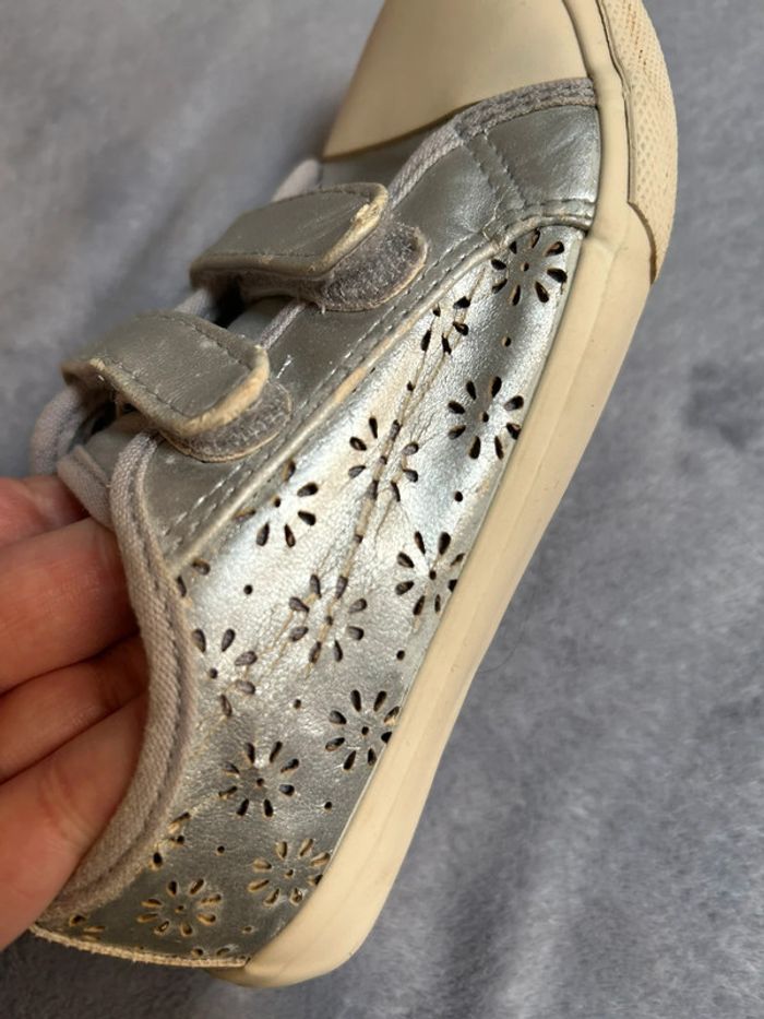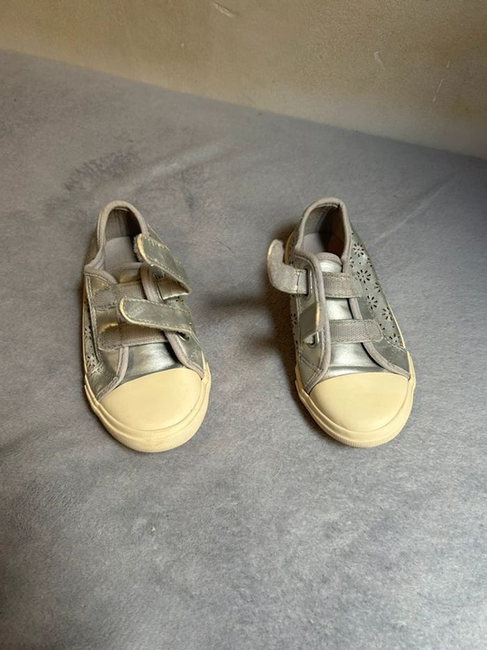Paire de Chaussures basket de ville pour enfant Taille 28 À scratch Couleur gris argenté et crème Pas portée juste stockée Quelques petits défauts : une chaussure à des craquelures sur les côtésa l’extérieur, et vernis un peu partie à l’arrière L’intérieur des chaussures est comme neuf, ainsi que les scratch Envoi rapide et soigné