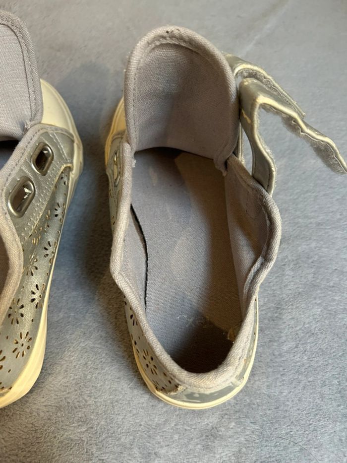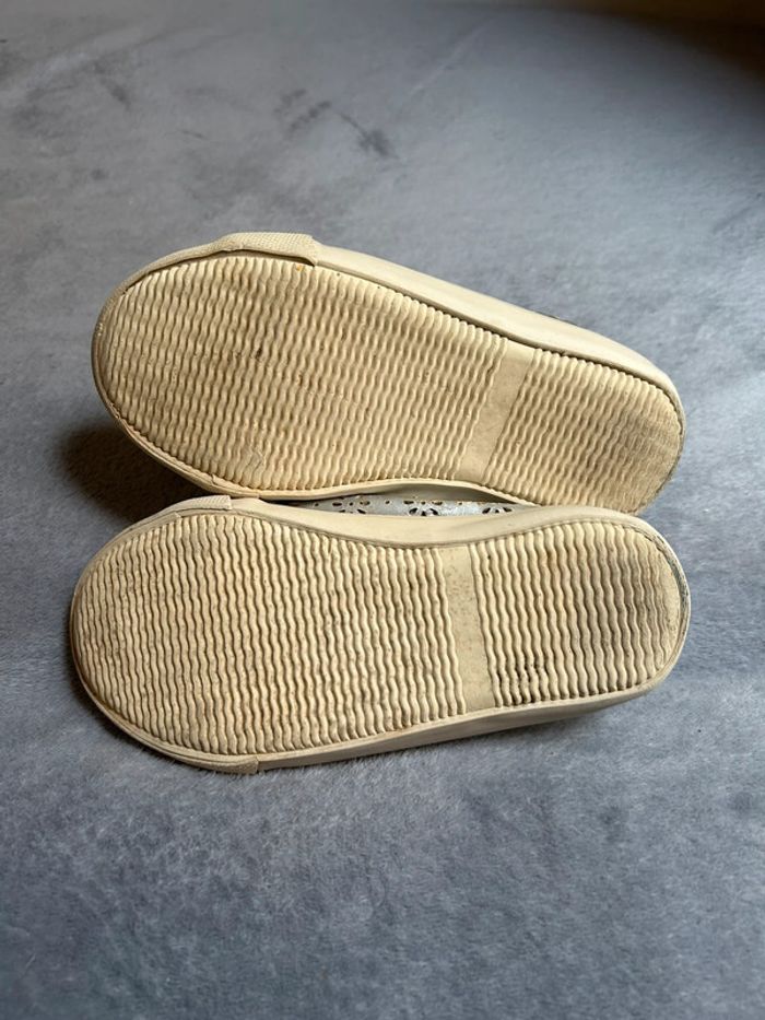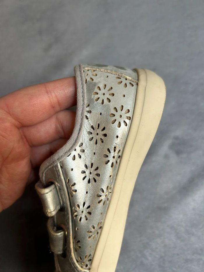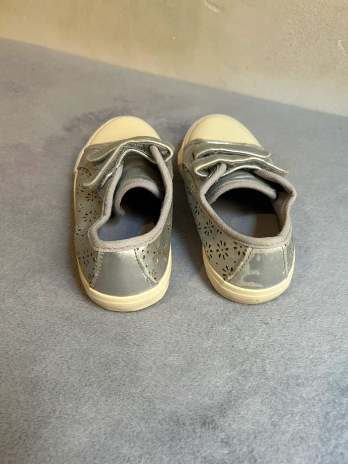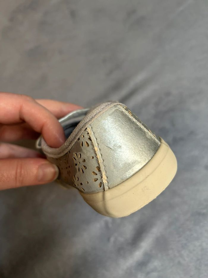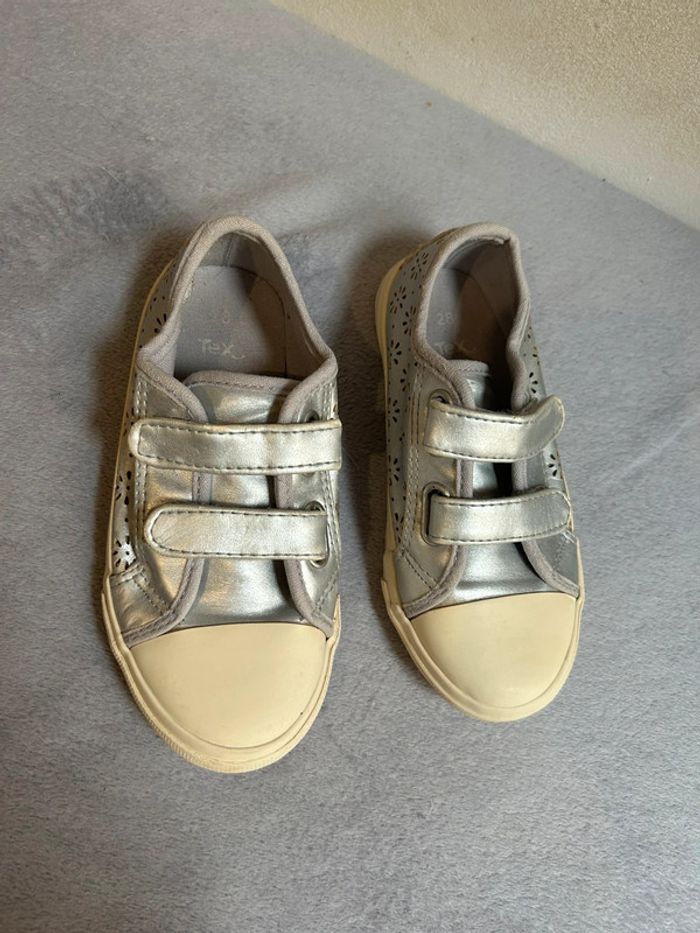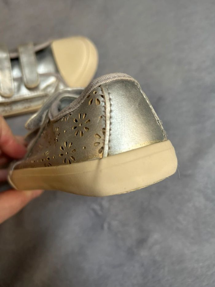 Paire de Chaussures basket de ville pour enfant Taille 28 À scratch Couleur gris argenté et crème Pas portée juste stockée Quelques petits défauts : une chaussure à des craquelures sur les côtésa l’extérieur, et vernis un peu partie à l’arrière L’intérieur des chaussures est comme neuf, ainsi que les scratch Envoi rapide et soigné