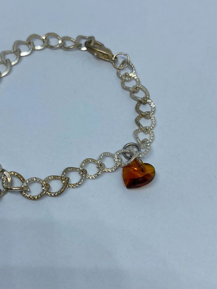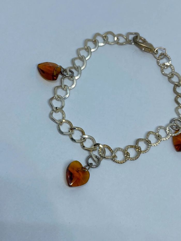 Bracelet fantaisie avec 3 coeurs orange foncé Avec Un côté maillons lisses de l’autre travaillé Matériel style acier Longueur 19cm Envoi rapide et soigné
