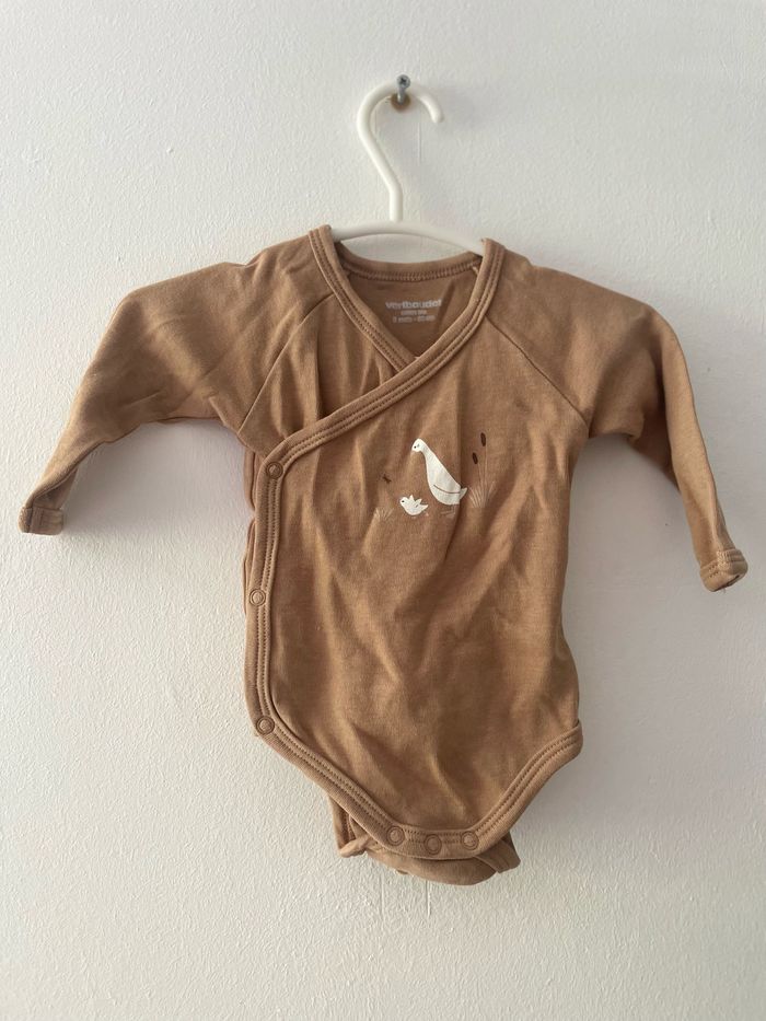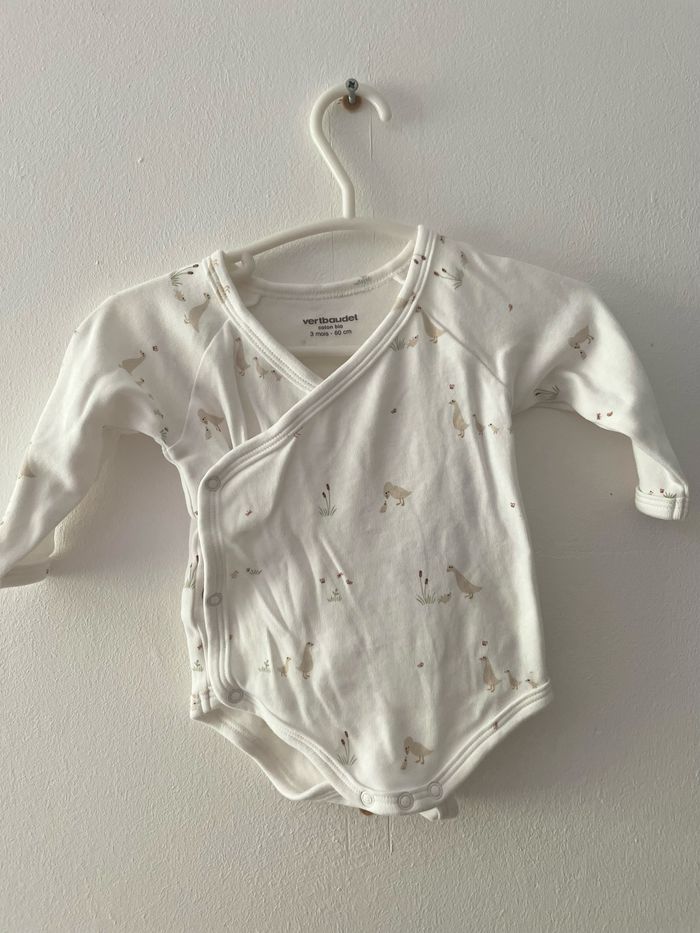 Lot de 3 bodies manches longues en coton bio ouverture en portefeuille 3 mois - 60 cm Vertbaudet 1 marron avec motif oie 1 blanc avec oie 1 gris / beige sans motifs Peut être mixte