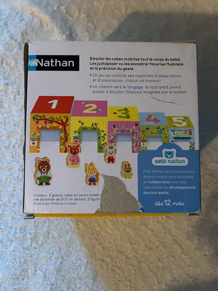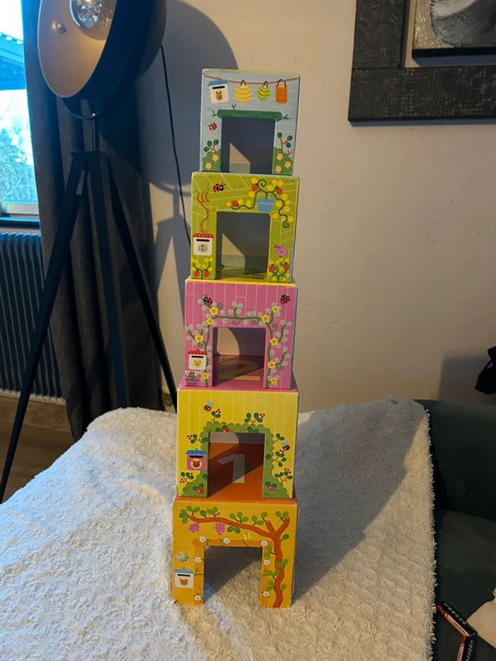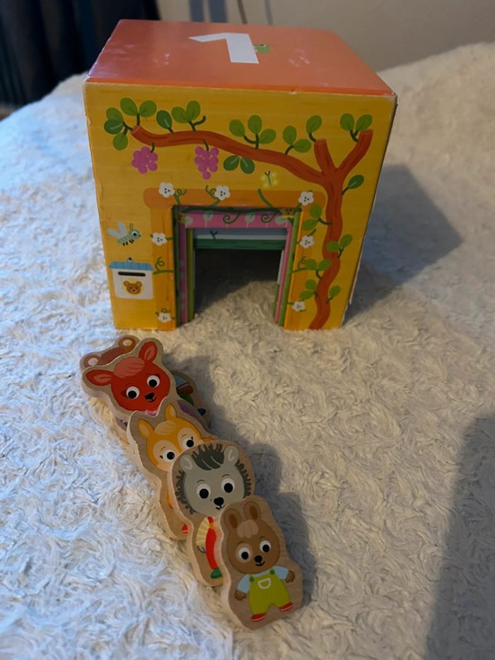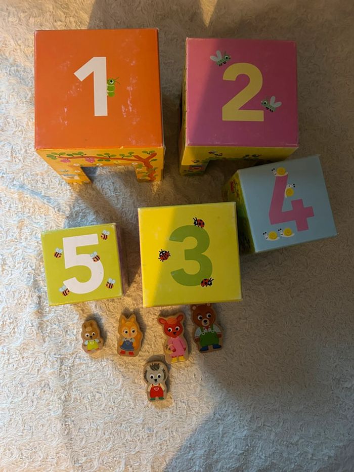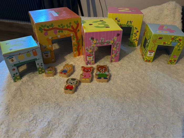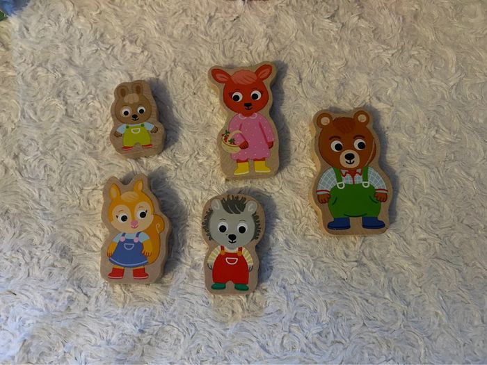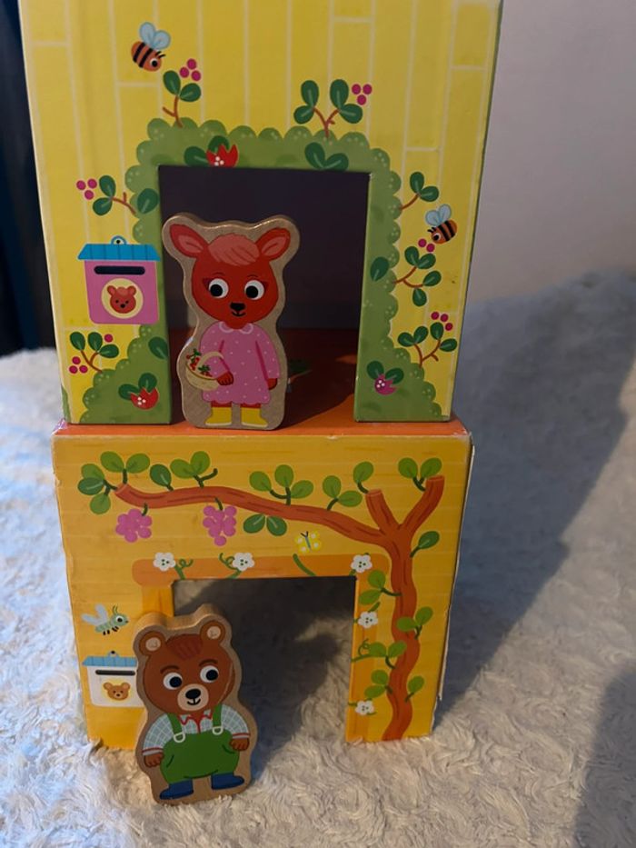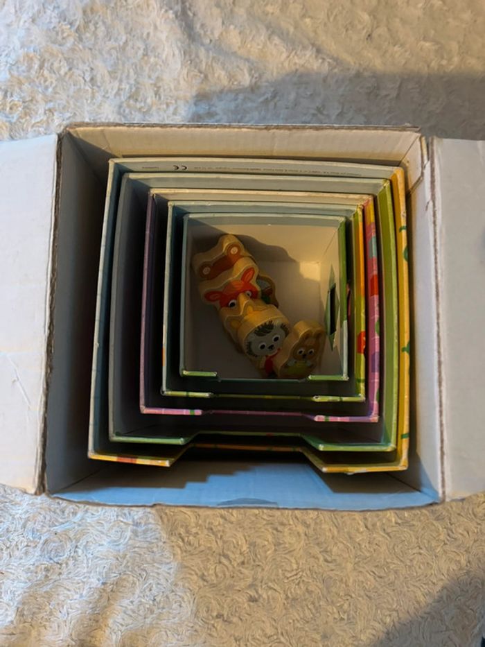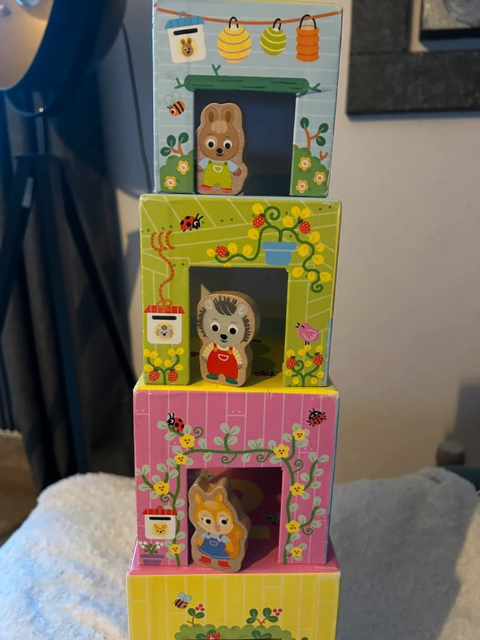 Personnages en parfait état Traces d’usure sur les « maisons » voir photo Boîte abîmée voir photo Un premier jeu à empiler pour découvrir les animaux et jouer avec les 5 pièces en bois avec des personnages animaux Prix neuf : 19,90€ Autres articles dans mon dressing N’hésitez pas à faire un lot pour optimiser les frais de port (A)