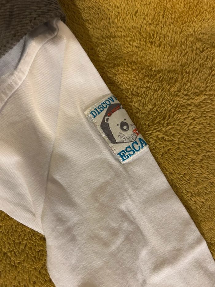 Très bel ensemble salopette et tee shirt assorti Salopette avec ouverture totale entrejambe par pression Poches avant et arrière En parfait état comme neuve (portée 1 fois) Tee shirt manches longues Motif sur le bras et fermeture dos par 3 pressions Une petite tache dans le bas devant (je n’ai pas lavé pour voir si ça part) Hormis cette petite tache (voir photo) en parfait état car porté 1 fois Autres articles dans mon dressing (5)