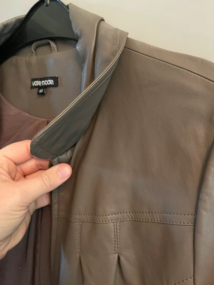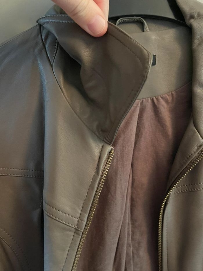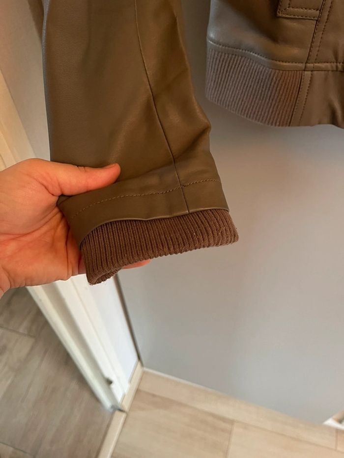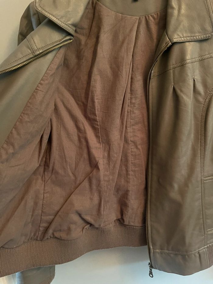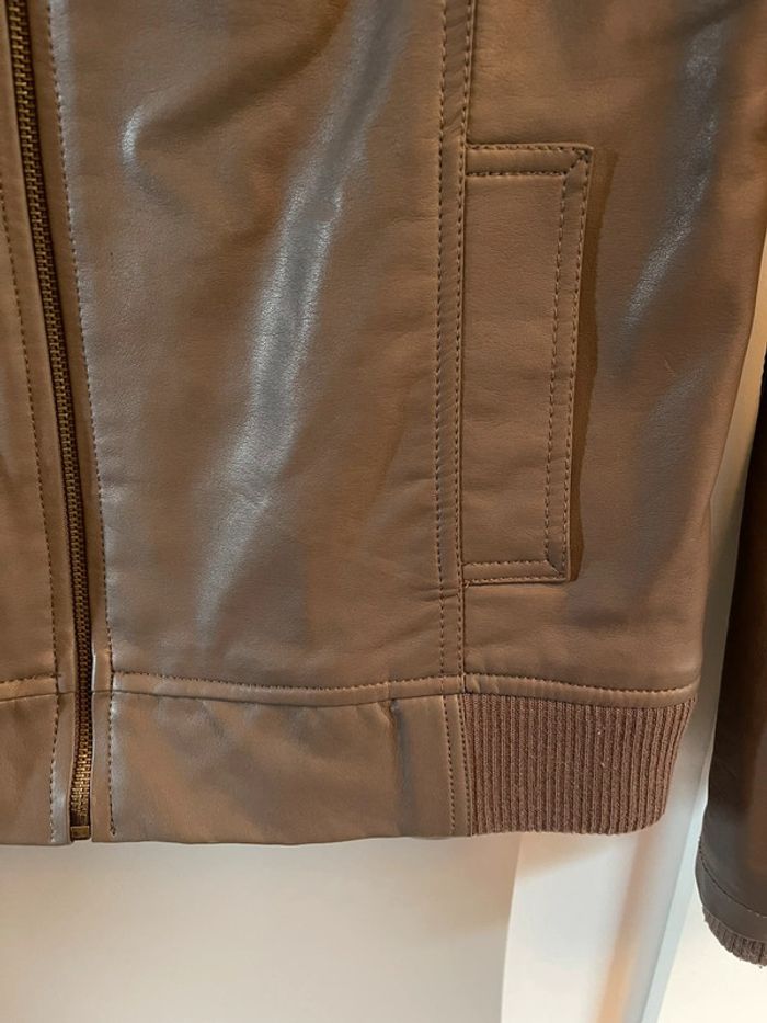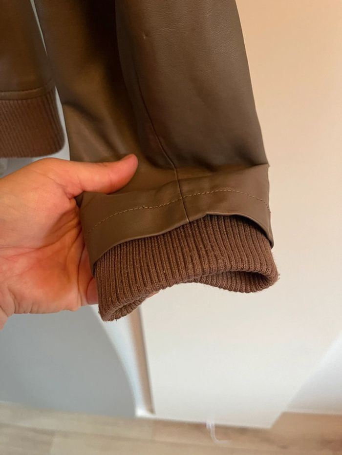 Très jolie veste style perfecto Peu portée 2 poches Qq traces d’usure (voir dernières photos après les mesures) Couleur marron glacé