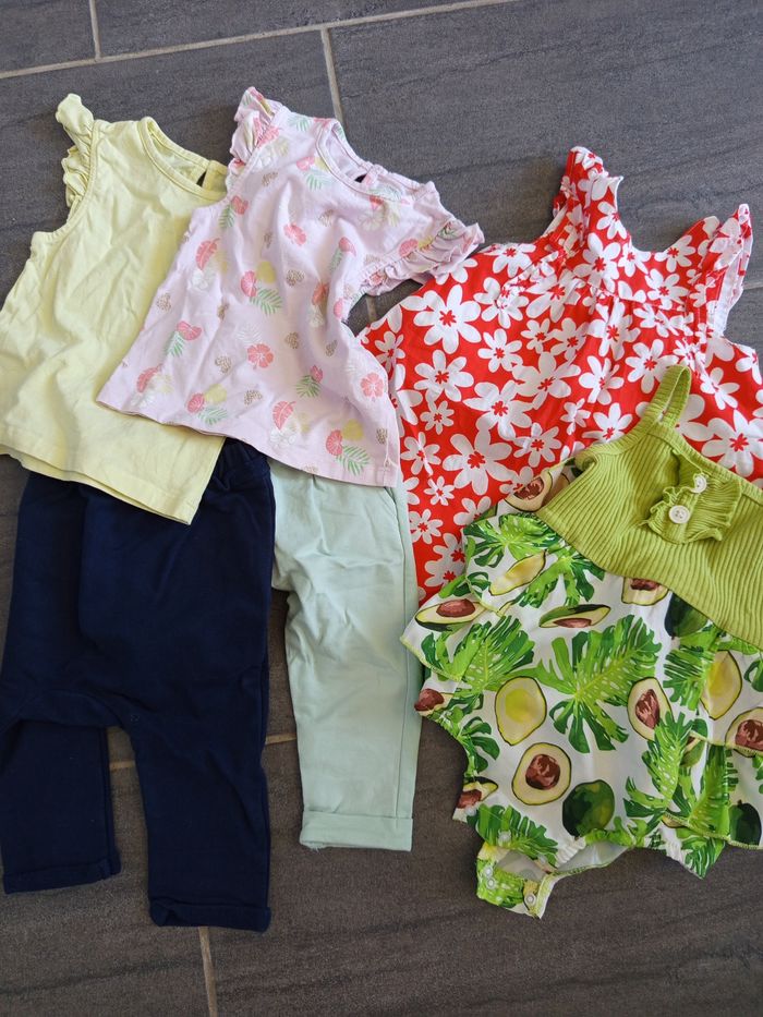 2 t-shirt, 2 pantalons légères, une robe et un body Orchestra 12 mois