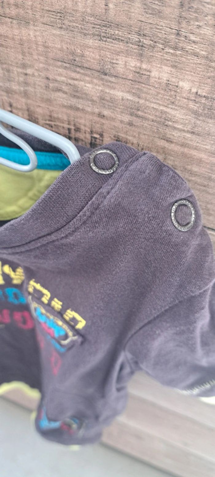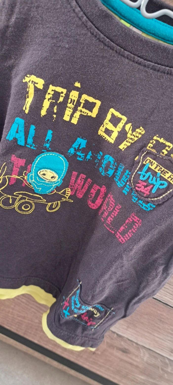 Tee-shirt marron et vert avec motifs et écritures sur le devant. De la marque Orchestra en taille 23 mois. En très bon état.