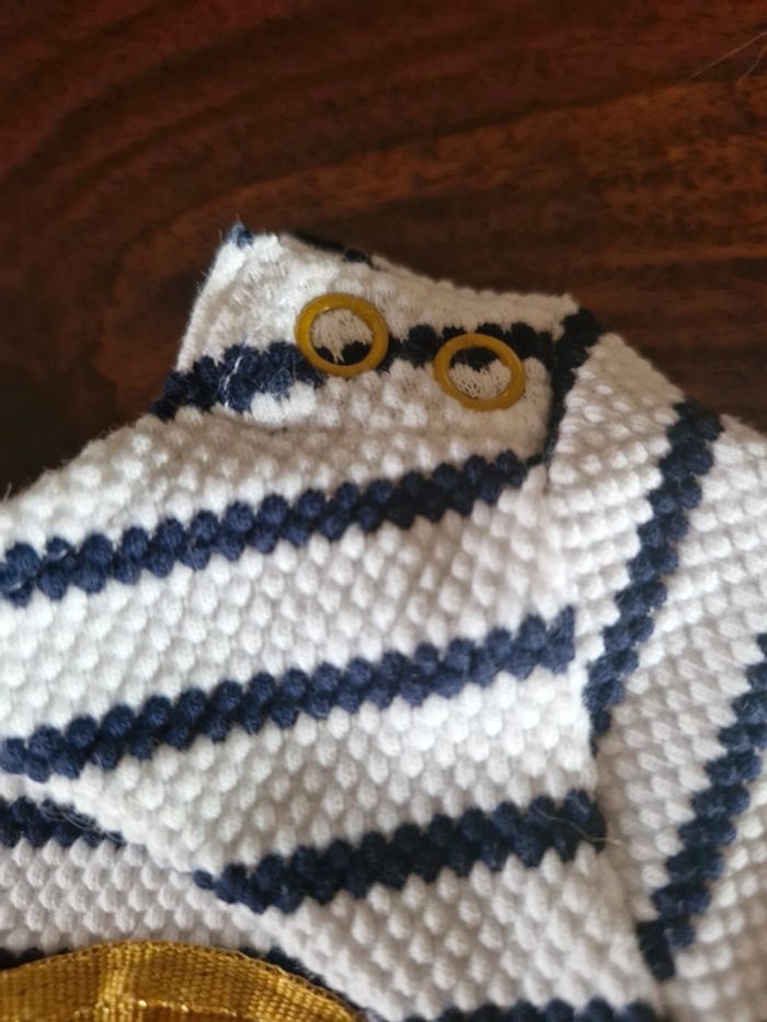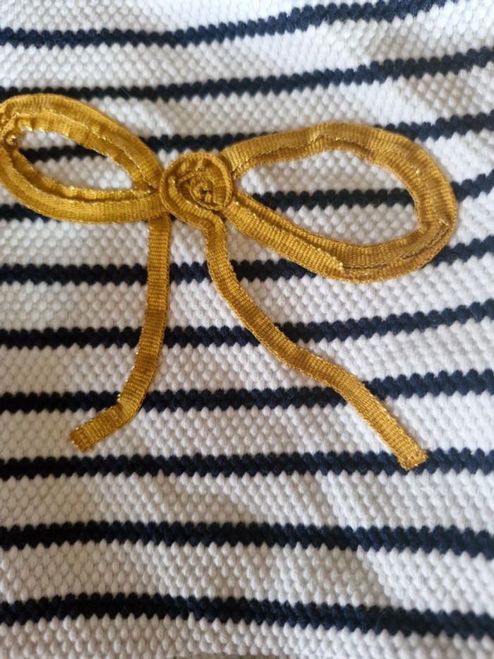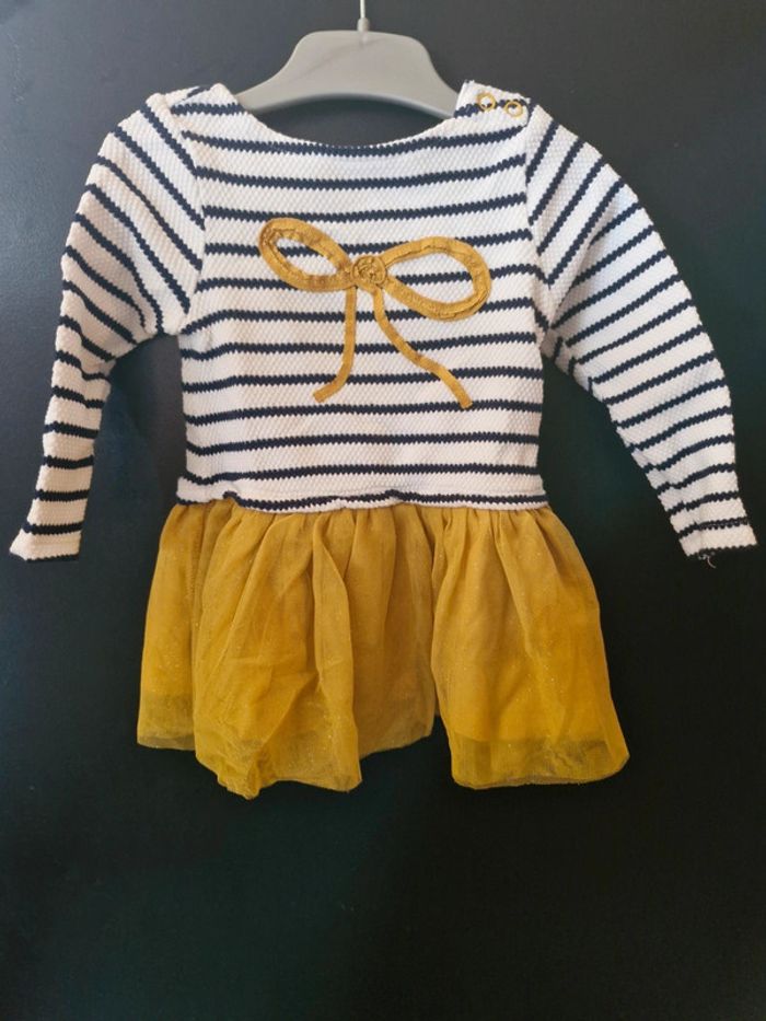 Robe manches longues Noeud doré et bas en tulle pailleté jaune moutarde doré. Haut rayé bleu marine et blanc Orchestra 6 mois