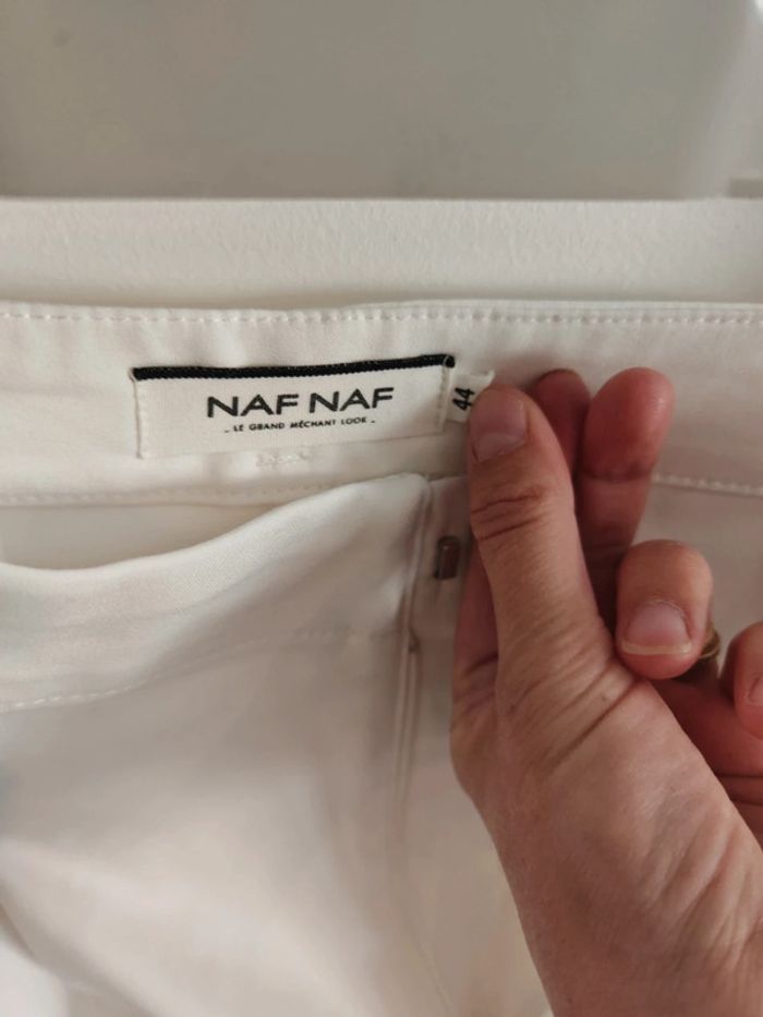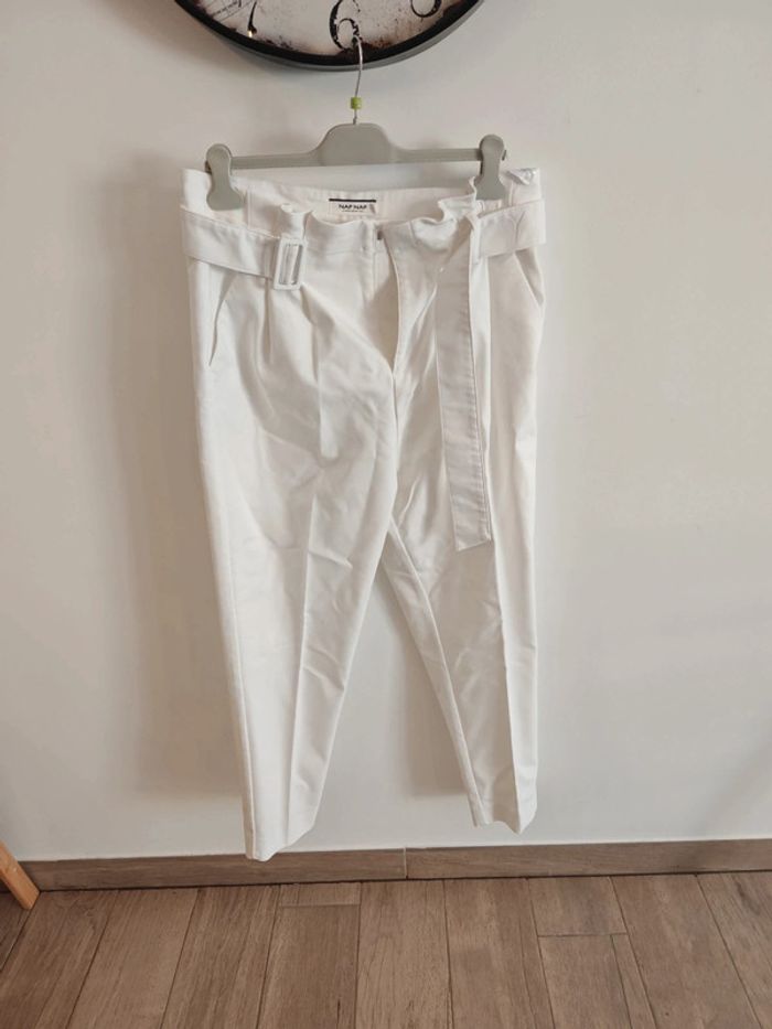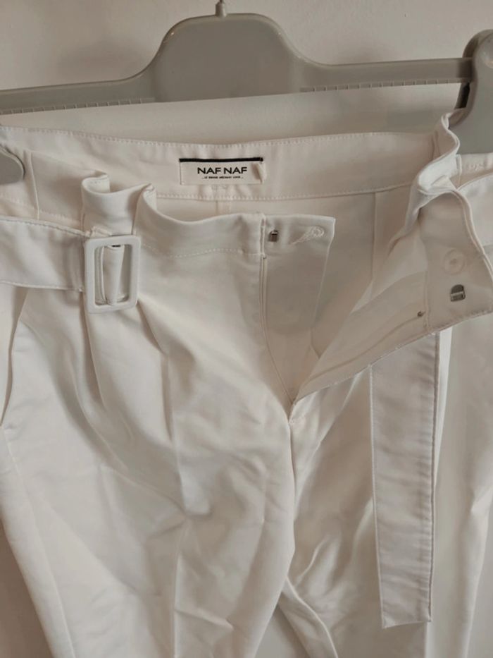 Pantalon blanc très classe, idéale pour cérémonie (mariage, baptême etc). Avec une ceinture. Marque : Naf Naf Taille 44 En parfait état