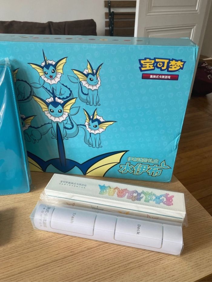 Bien lire l’annonce Bonjour Box Chinoise Aquali / Vaporeon contenant : - le binder exclusif Aquali - les sleeves exclusives Aquali - la tapis exclusif Evolitions et sa boîte de rangement Tout est neuf Il n’y a pas de boosters ni les cartes promos Box Pyroli également disponible