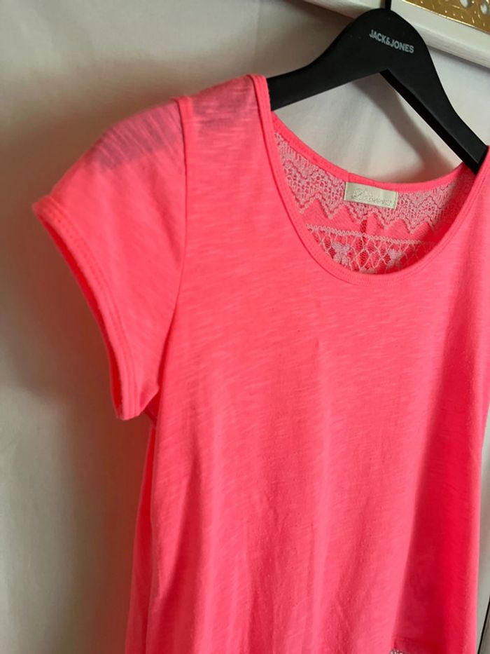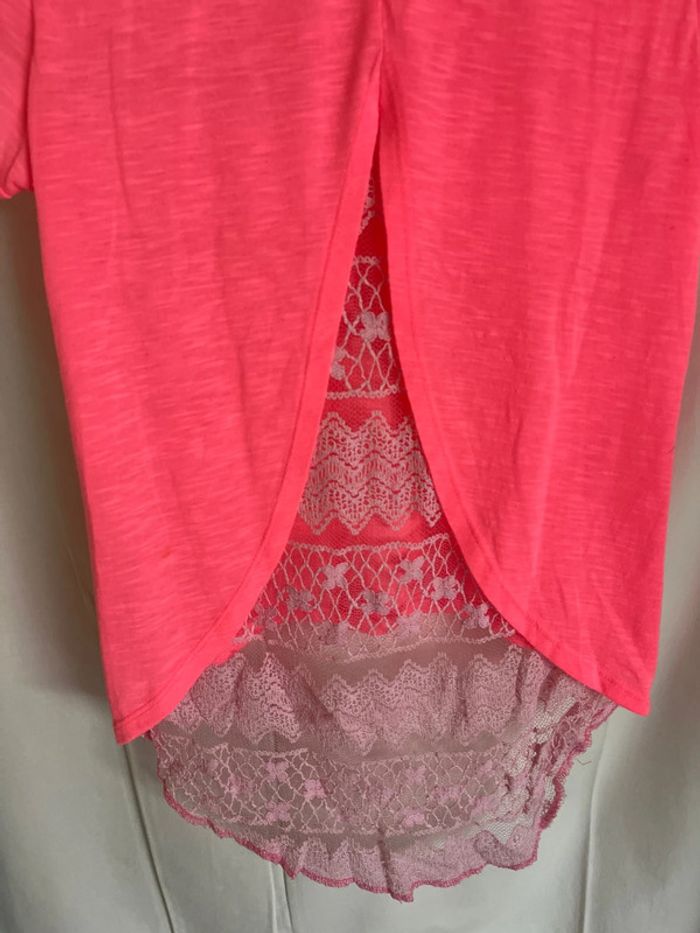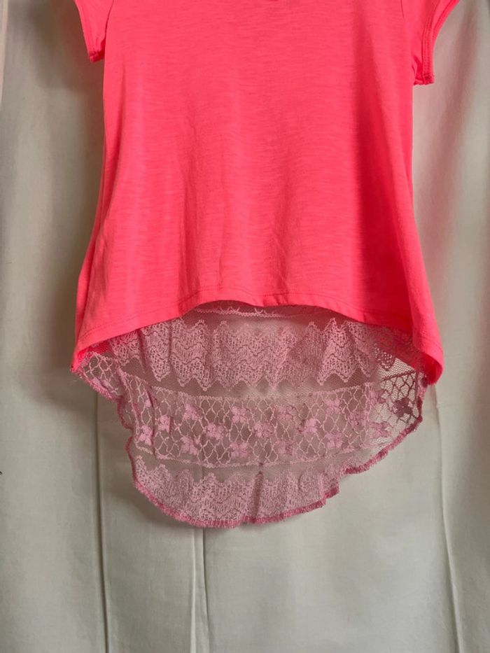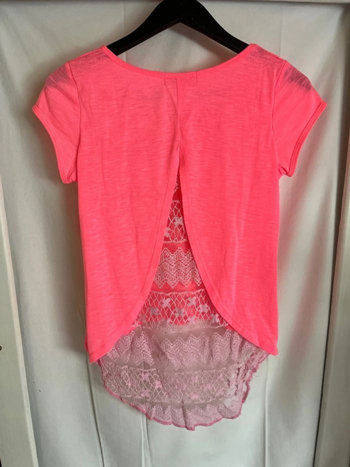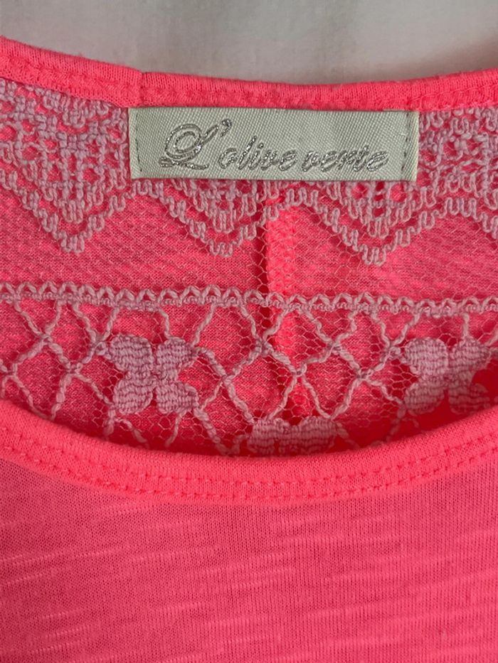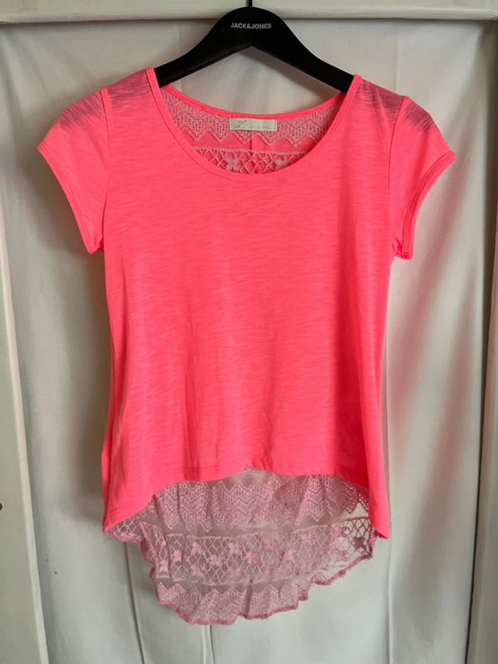 Vend t-shirt couleur flashy. Manches courtes. Dos évasé avec pan en dentelle.