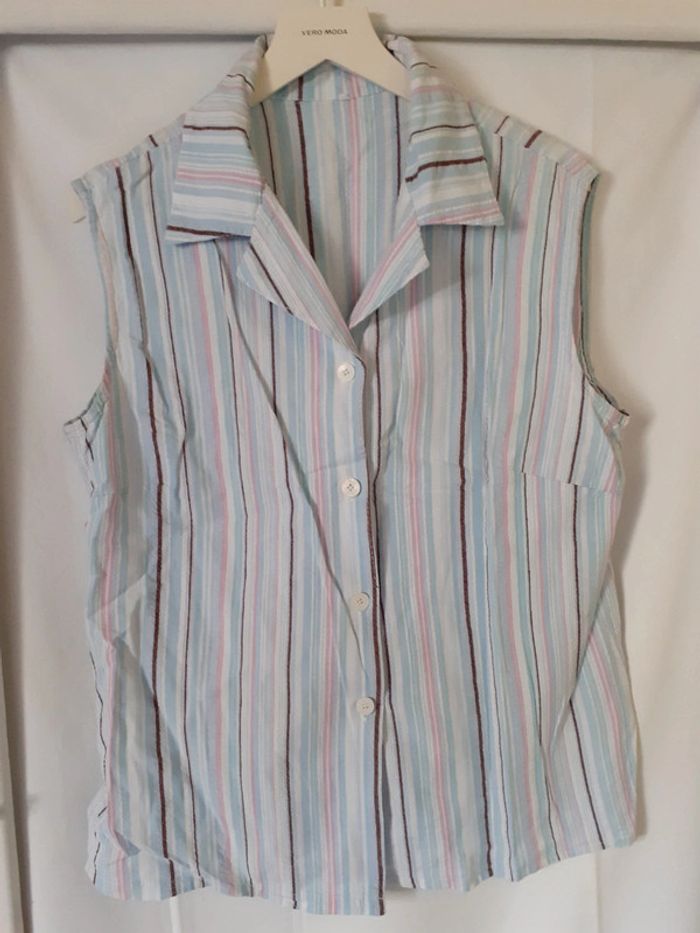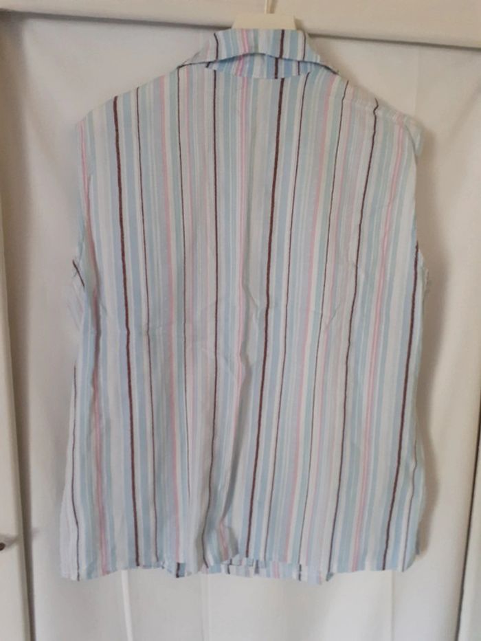 Vend chemise à rayures, sans manches. Petites fentes sur les côtés. Fermeture par bouton