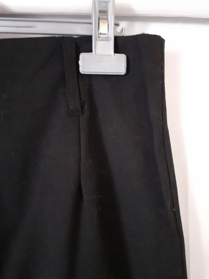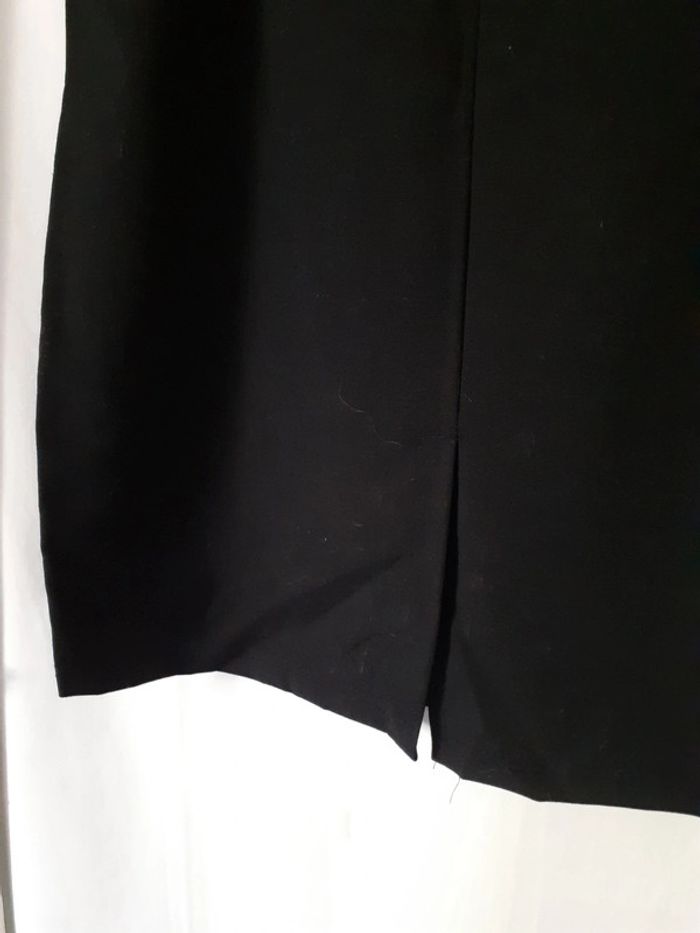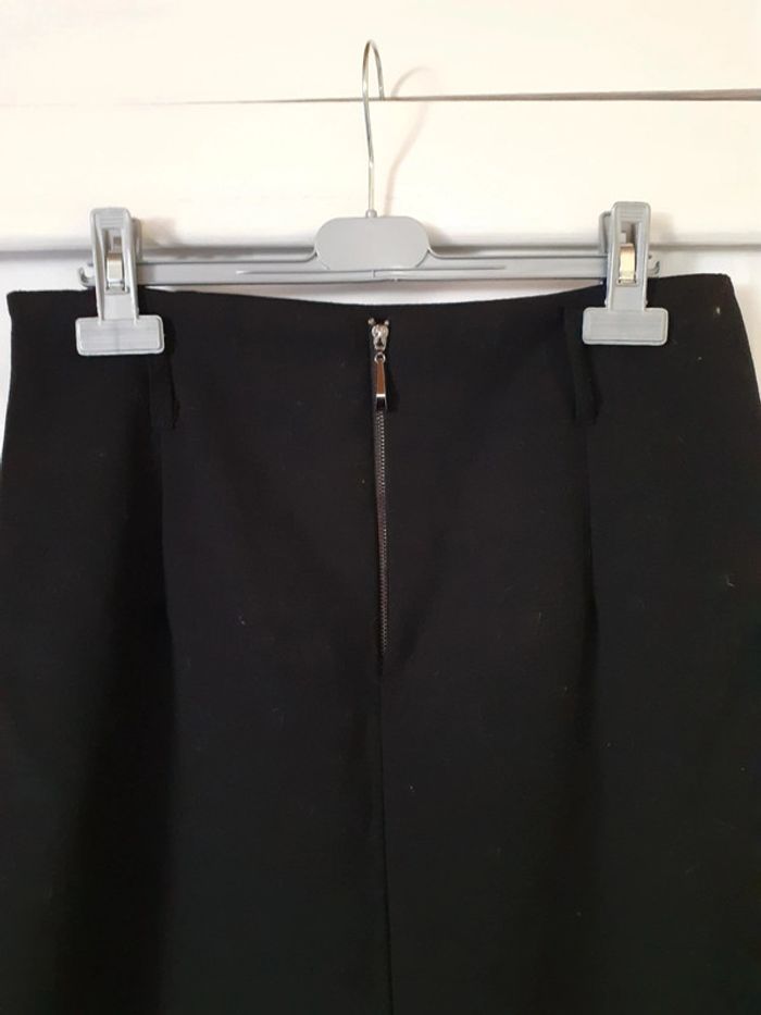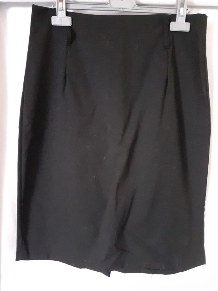 Vend jupe droite noire. Petite fente à l'arrière. Fermeture éclair à l'arrière.
