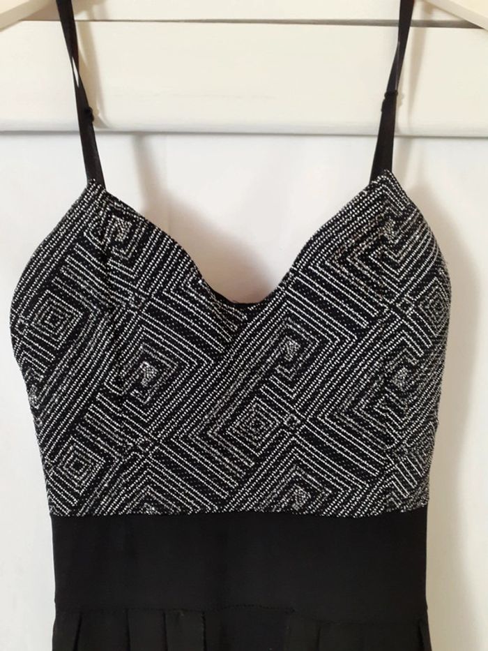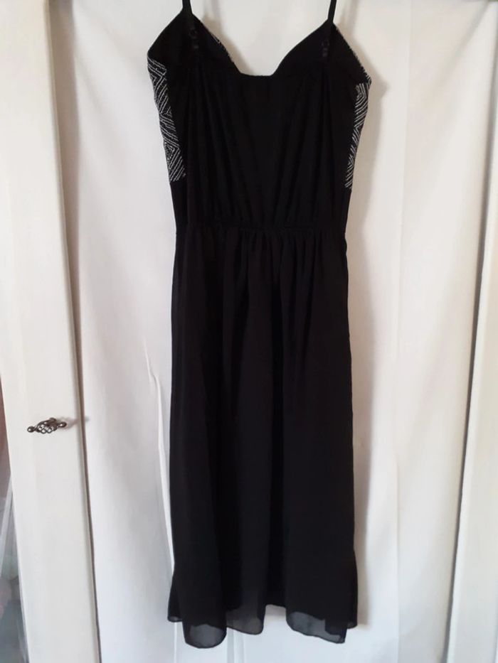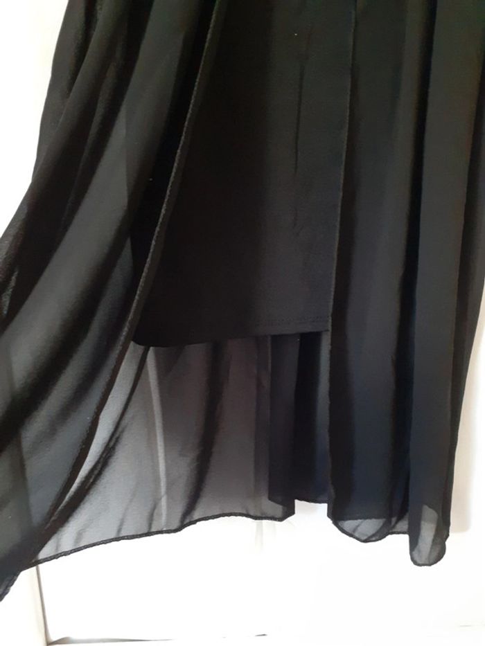 Vend jolie robe noire avec fines bretelles réglables. Strass sur la partie bustier. Voile sur la partie basse. Portée une fois