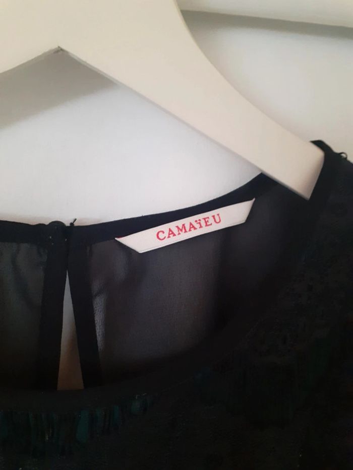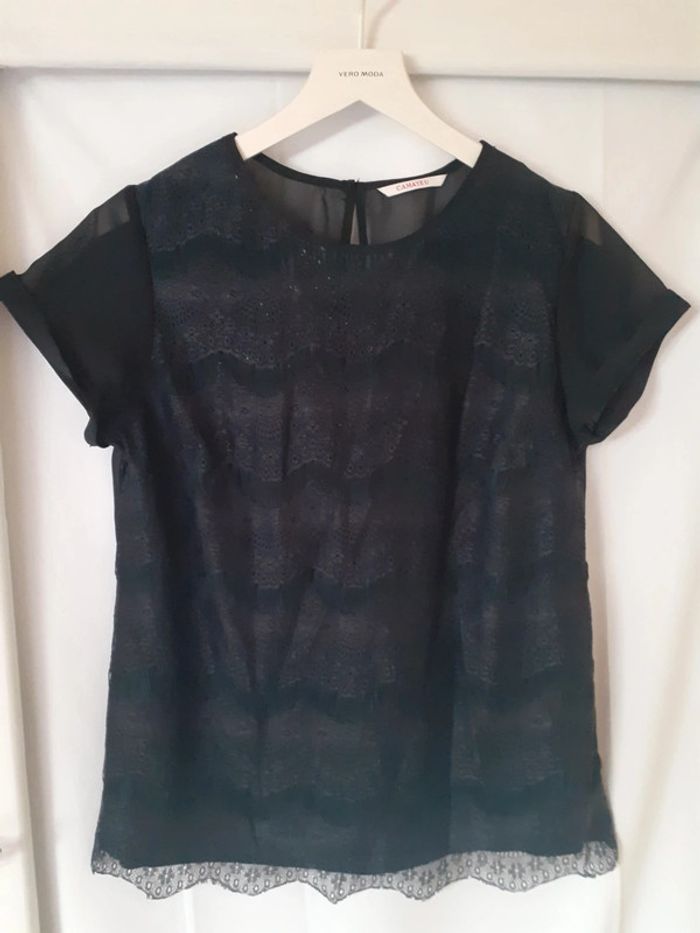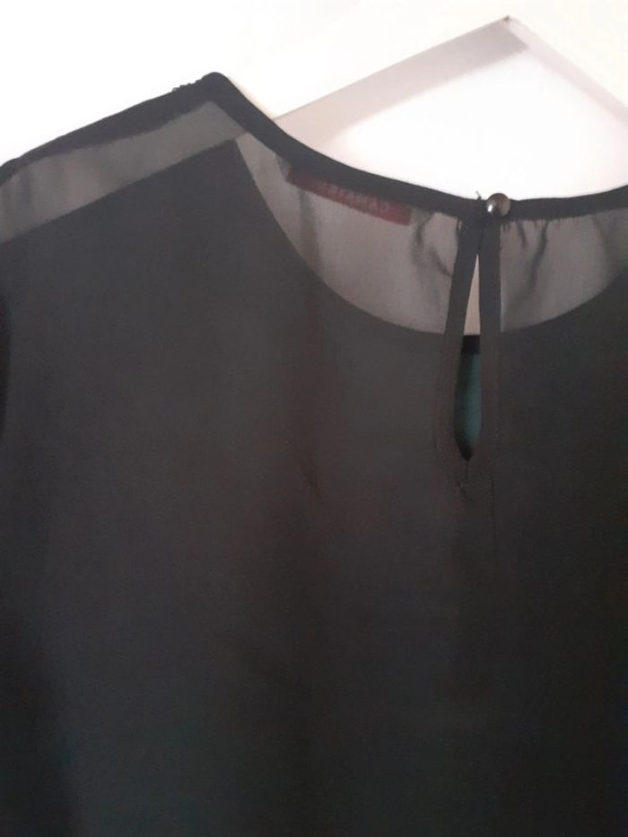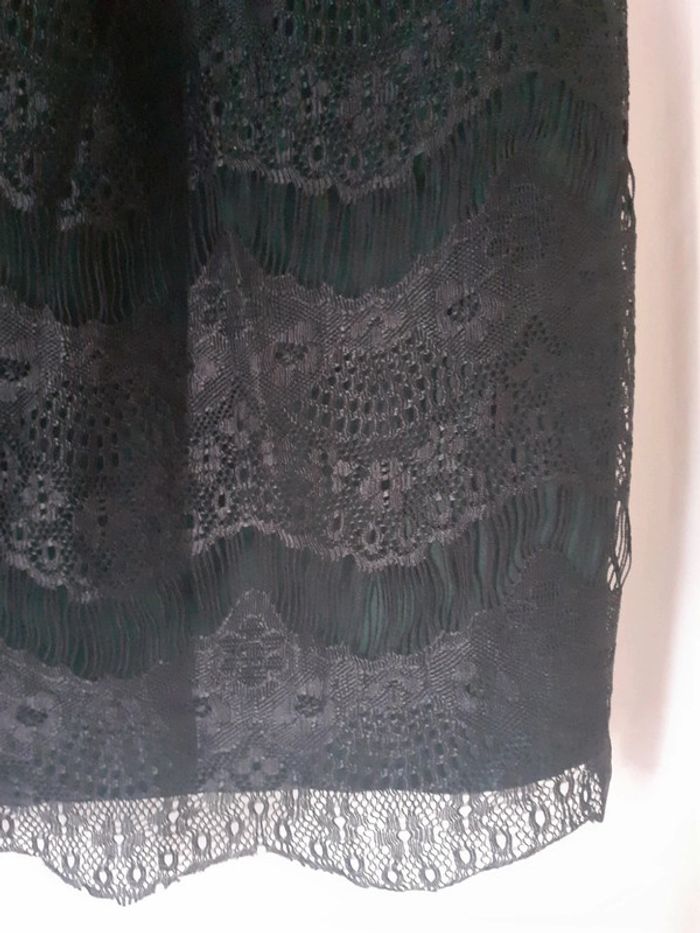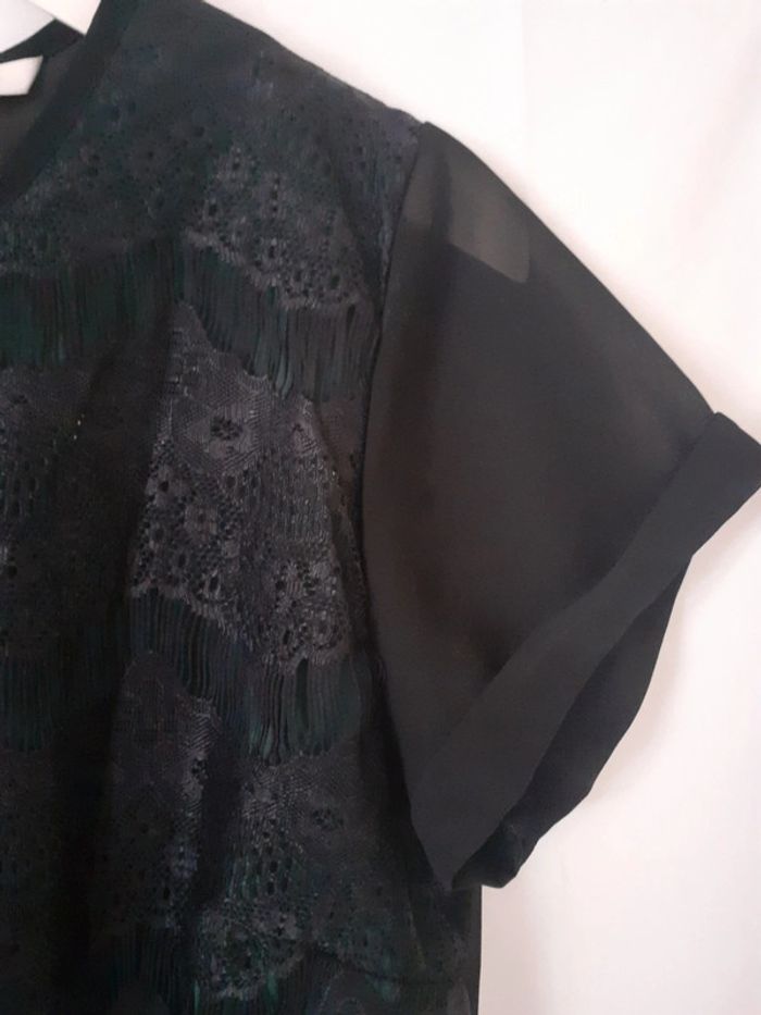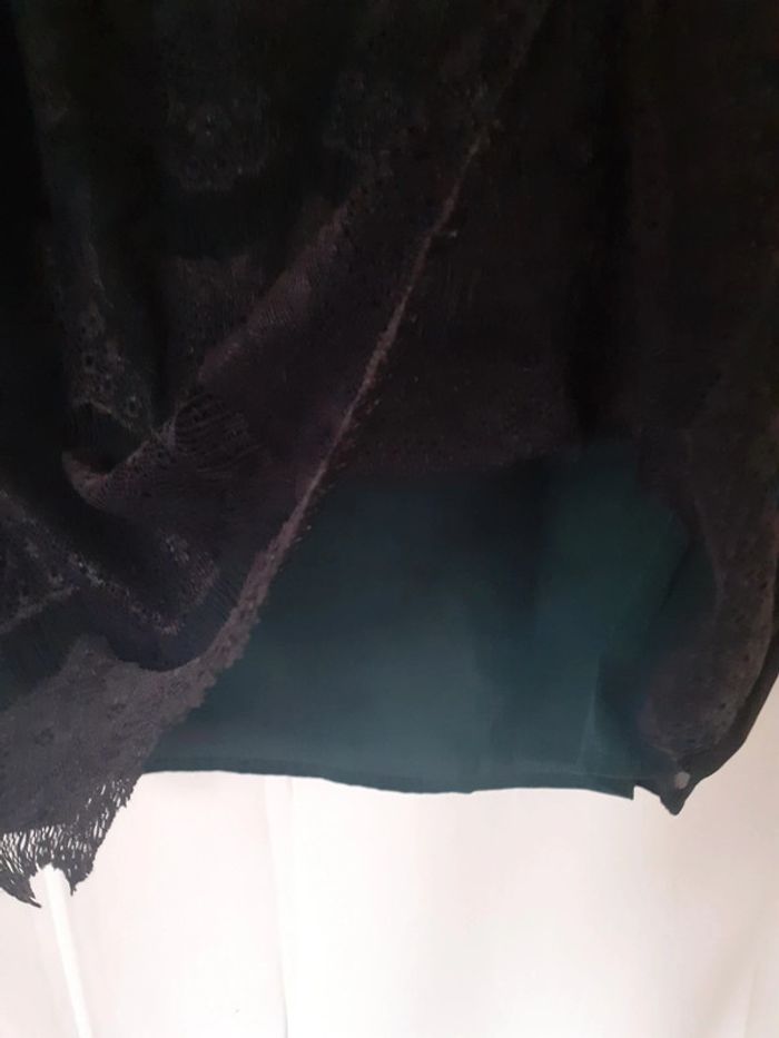 Vend une jolie blouse en deux couches. En-dessous le tissu est de couleur vert foncé, et par-dessus il y a de la dentelle sur l'avant et du voile sur l'arrière.