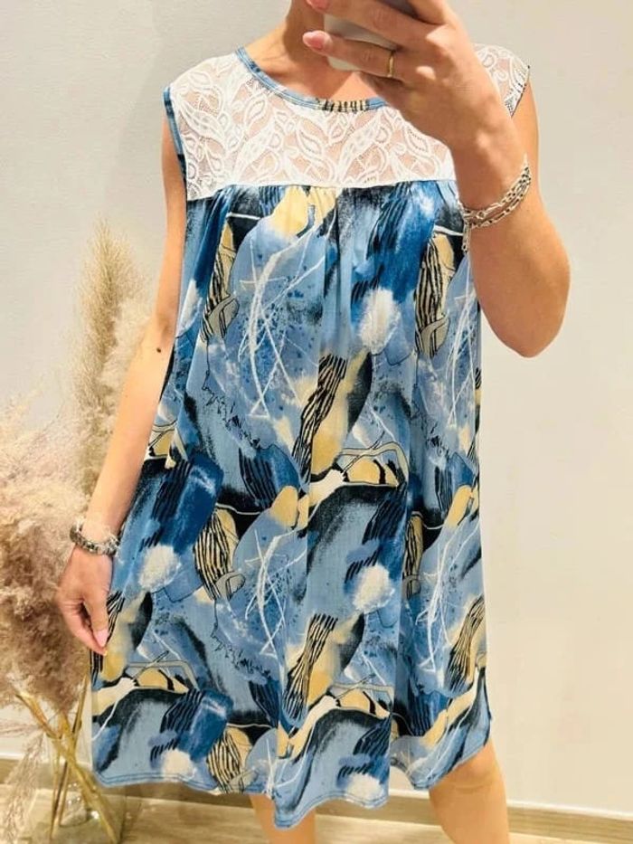 Robe femme midi sans manches bleu et dentelle - photo numéro 1