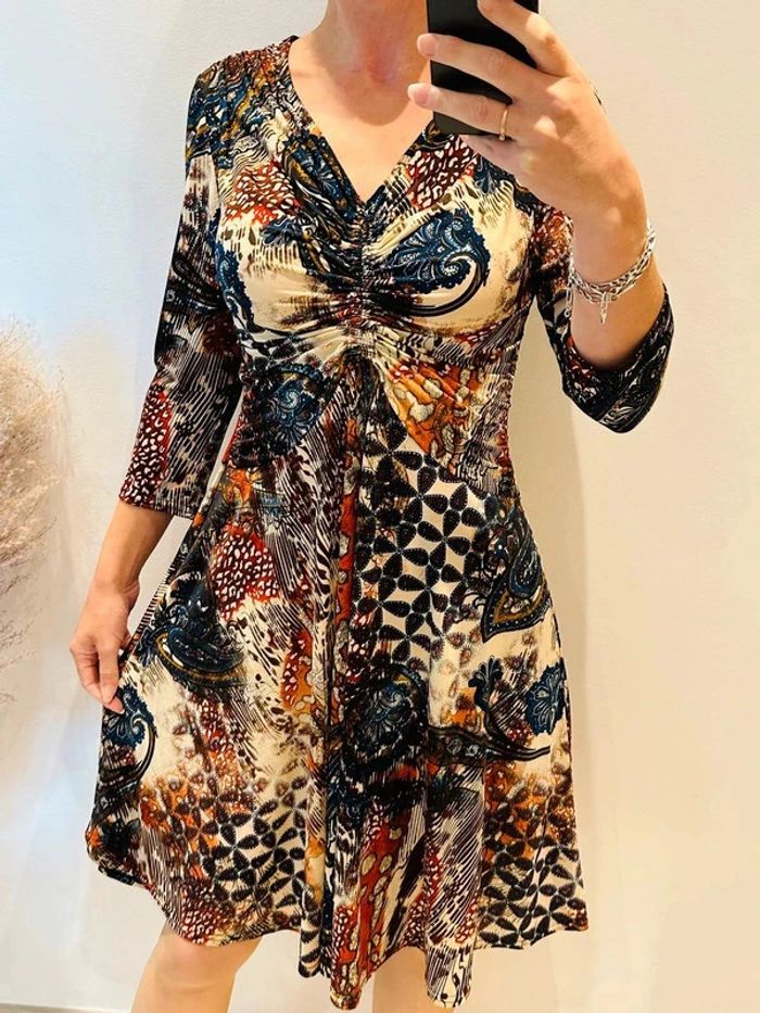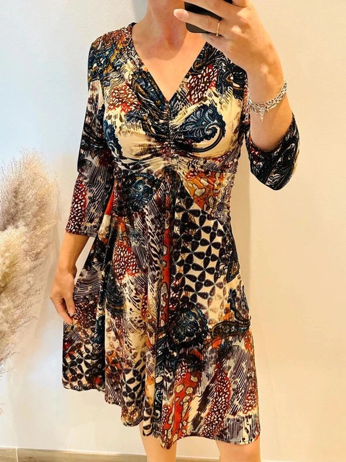 Jolie Robe femme col V très agréable a porter ajustée longeur midi environ genoux selon taille multicolore Taille 36/38 S/M #robefemme #robe #femme #manche3/4 #midi #faisladifference #robemidi #multicolore #misaison #femme3638 #taillesm