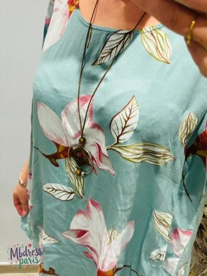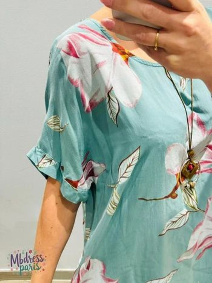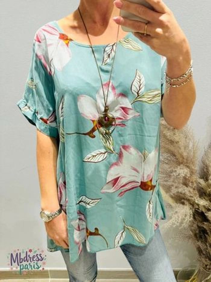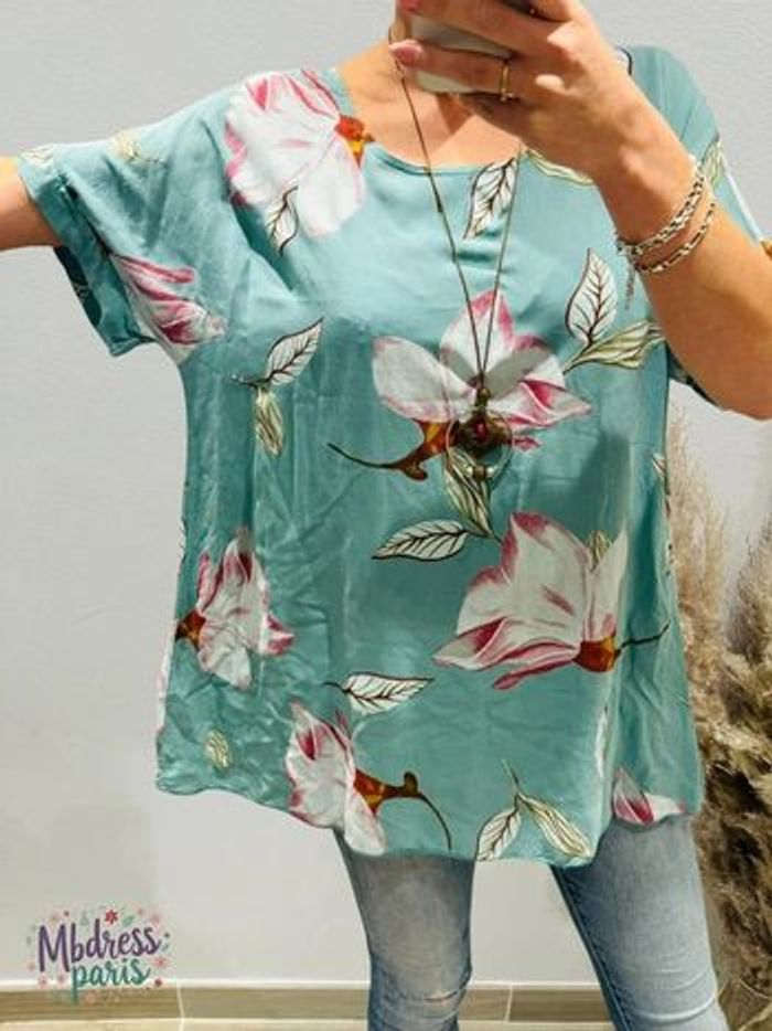 Blouse femme manche courte Fluide et agréable a porter idéal mi saison printemps / été avec une jolie veste en jeans par exemple pour un style decontracté et élégant a la fois 95% viscose 5% Elasthanne taille unique 38/44 Avec collier Couleur céladon (mélange de vert et bleu) et motifs fleurs #blouse #femme #manchecourte #faisladifference #printemps #ete #collier #fleuri #fleur #blousefemme #italy R B8
