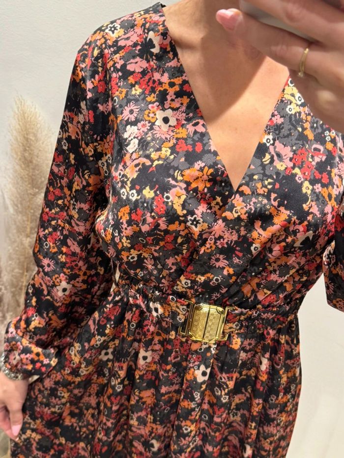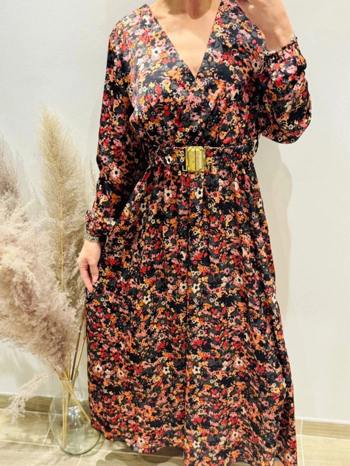 Jolie robe longue maxi femme Beau cache cœur Élastique sous poitrine Fleurie multicolore Taille unique mais convient pour 38/40 M/L (taille française) Ceinture avec boucle dorée, fournie
