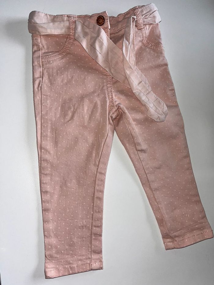 Petit jean avec petit ceinture rose pour bébé taille 18 mois réglable sur les côtés. ( peluche sur la ceinture qui partira au lavage)