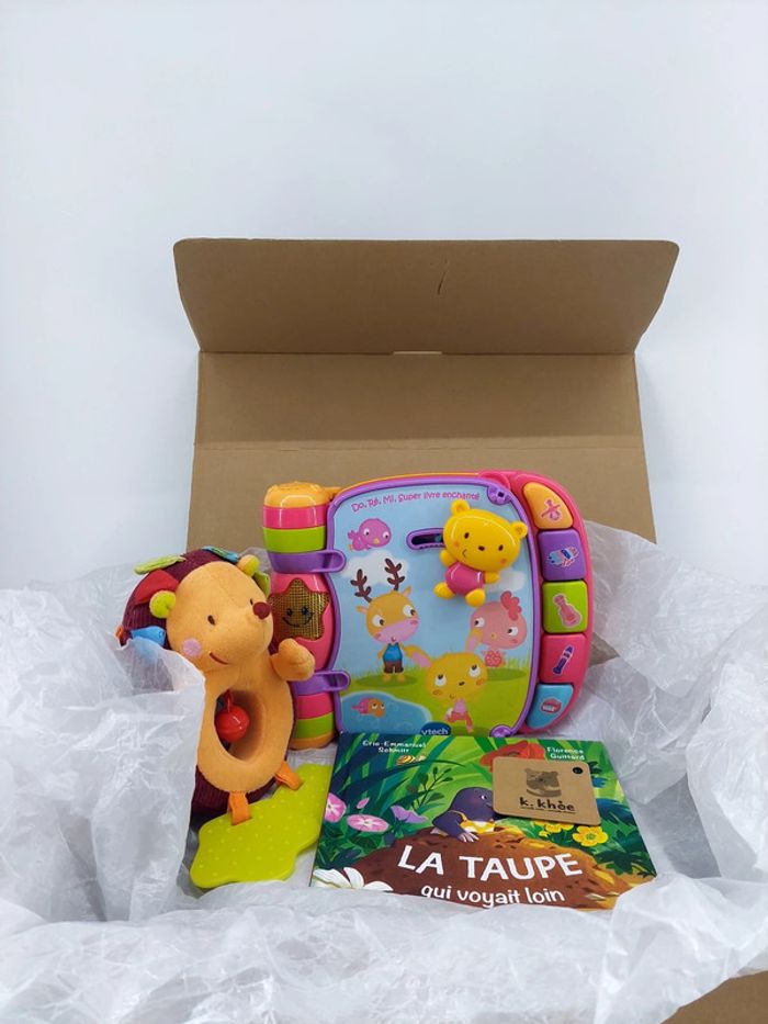 - livre interactif: Age: à partir de 6 mois Marque: Vtech Livre d’éveil interactif Do Ré Mi mon super livre enchanté Nécessite des piles - livre: La taupe qui voyait loin Édition Hachette jeunesse - hochet hérisson: Marque: Lilliputiens Doudou Simon le hérisson, en velours bordeaux, avec des piquants en tissu granuleux, soyeux, doux et velouté. Clochette au centre. Ses 2 pieds sont des anneaux de dentition. Lien au dos pour l'attacher Valeur neuf: 50 euros Produits reconditionnés #kkhoe #lilliputienskkhoe #lilliputiens #vtechkkhoe #vtech #6moiskkhoe #coffretkkhoe