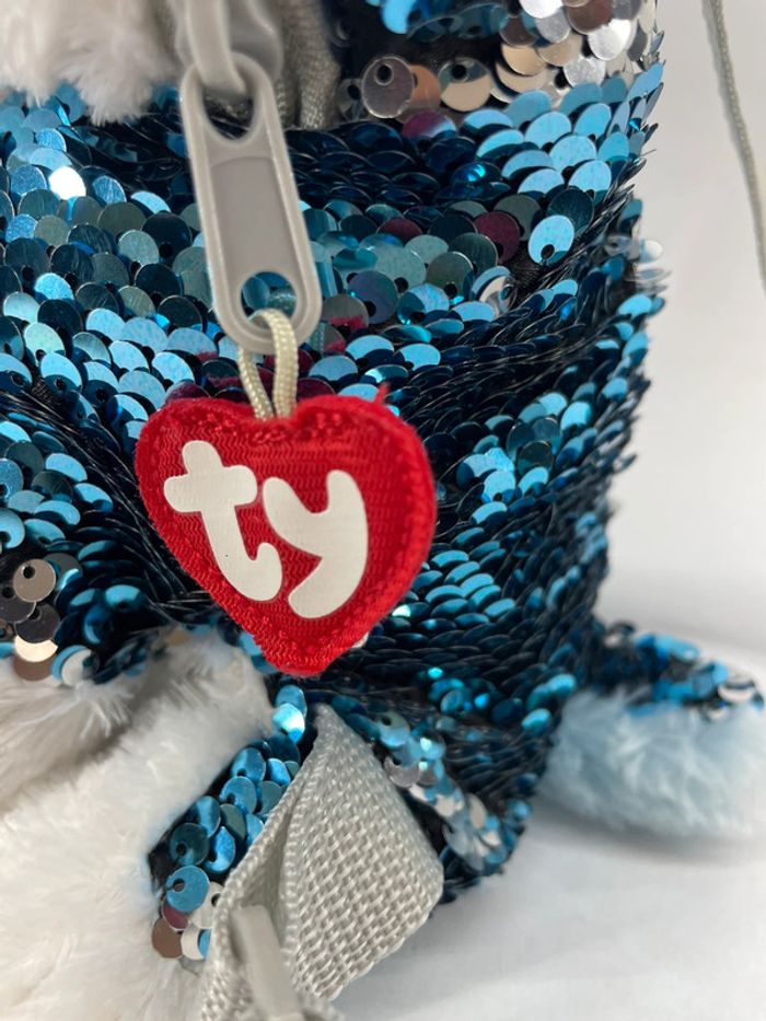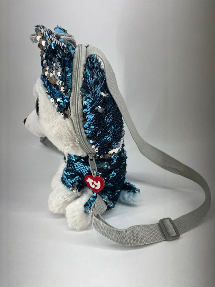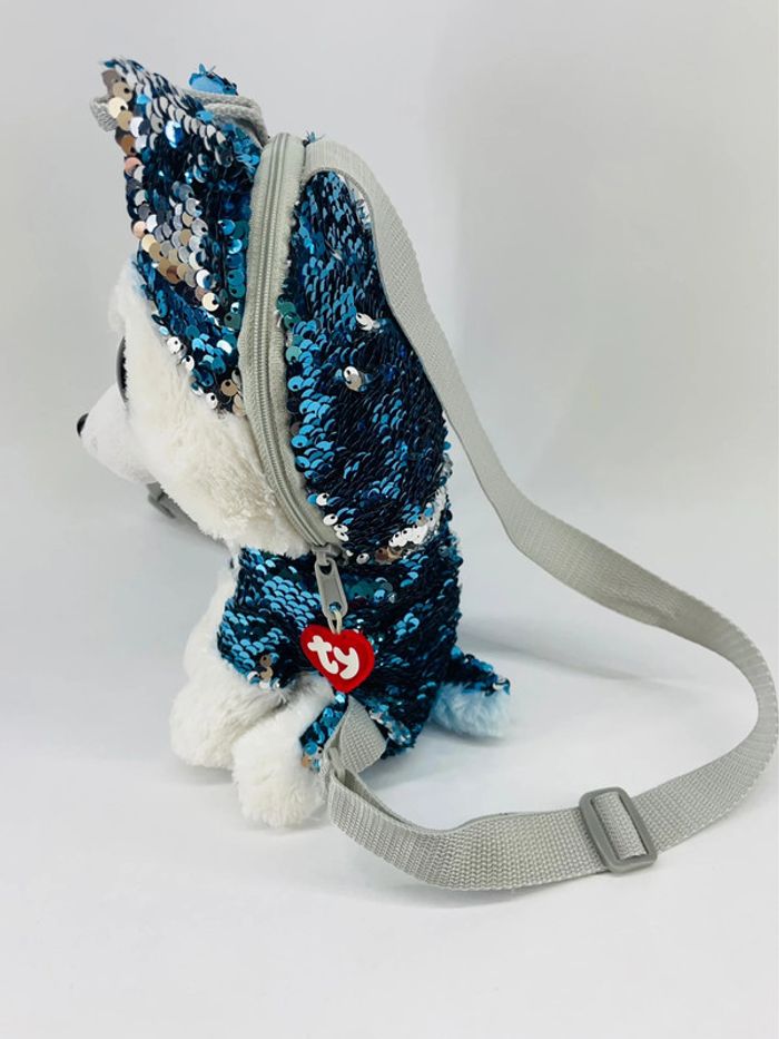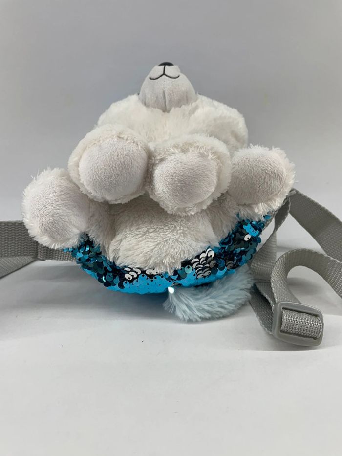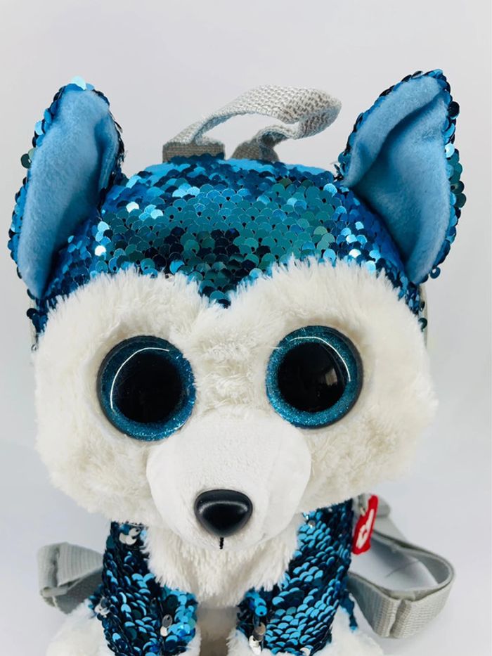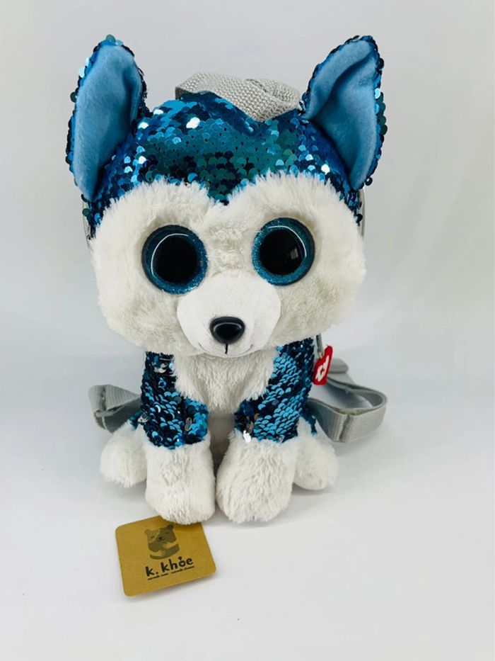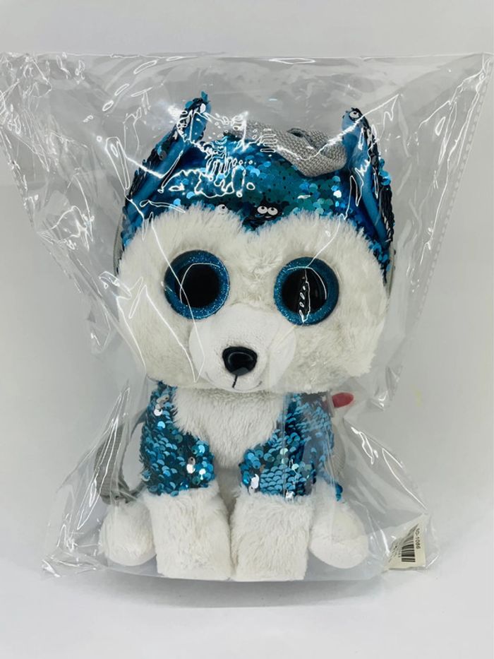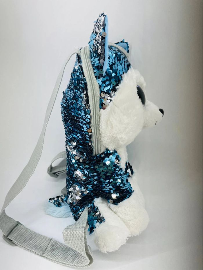 Très mignon Sac à Dos à Sequins Slush le Chien de Traineau ! Avec ses grands yeux bleus et ses sequins flippables, Slush le Chien de Traîneau est très tendance. Votre enfant pourra glisser tous ses trésors dans la poche à glissière sur le dessus. Et les bretelles réglables en longueur s'adaptent à sa taille. Dès 3 ans. Valeur neuf : 25 euros