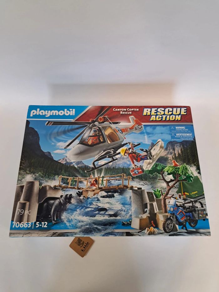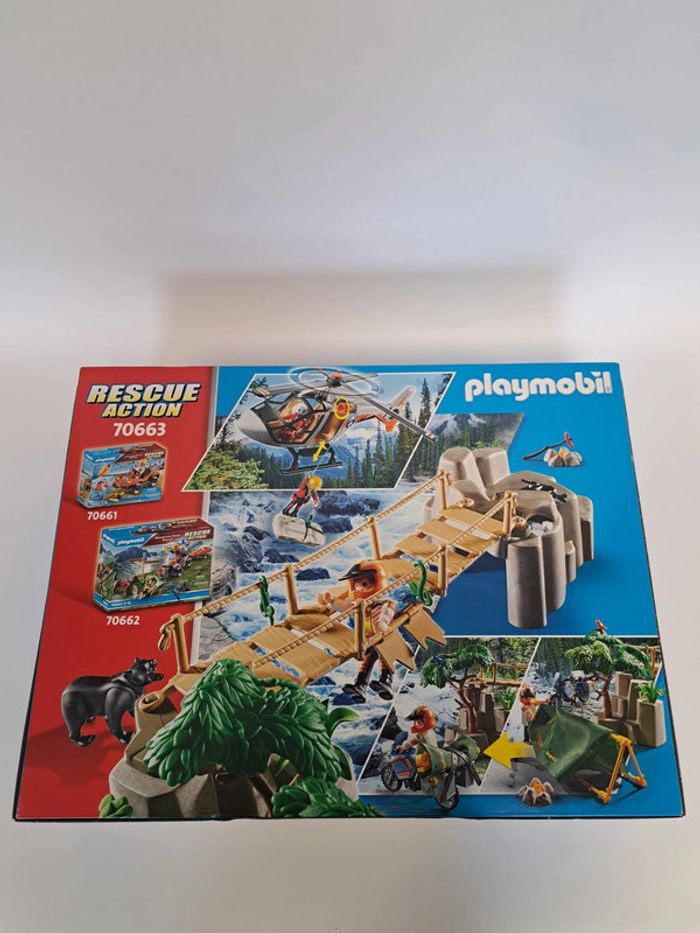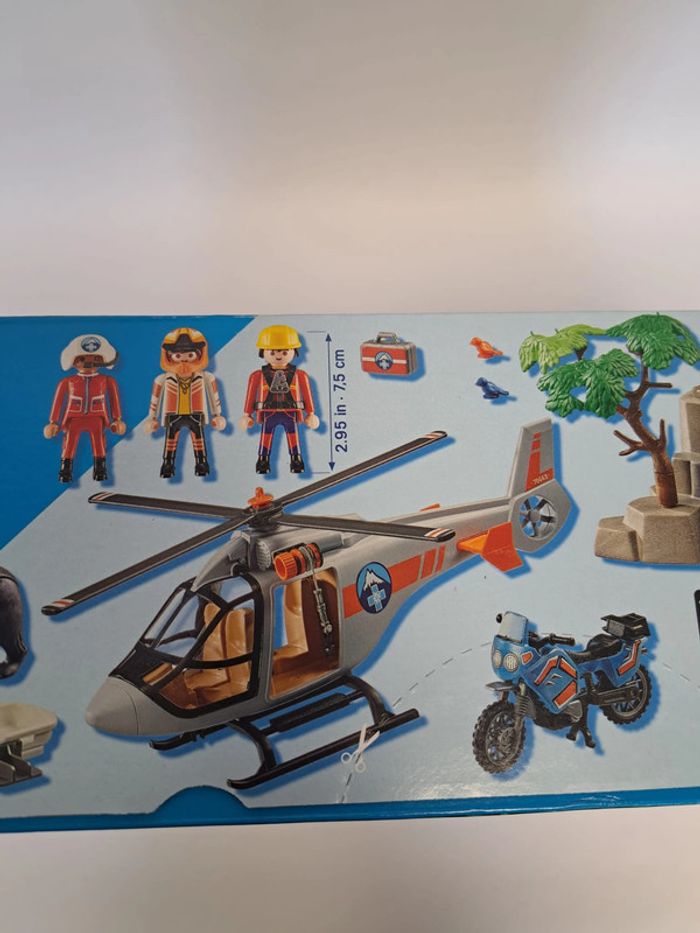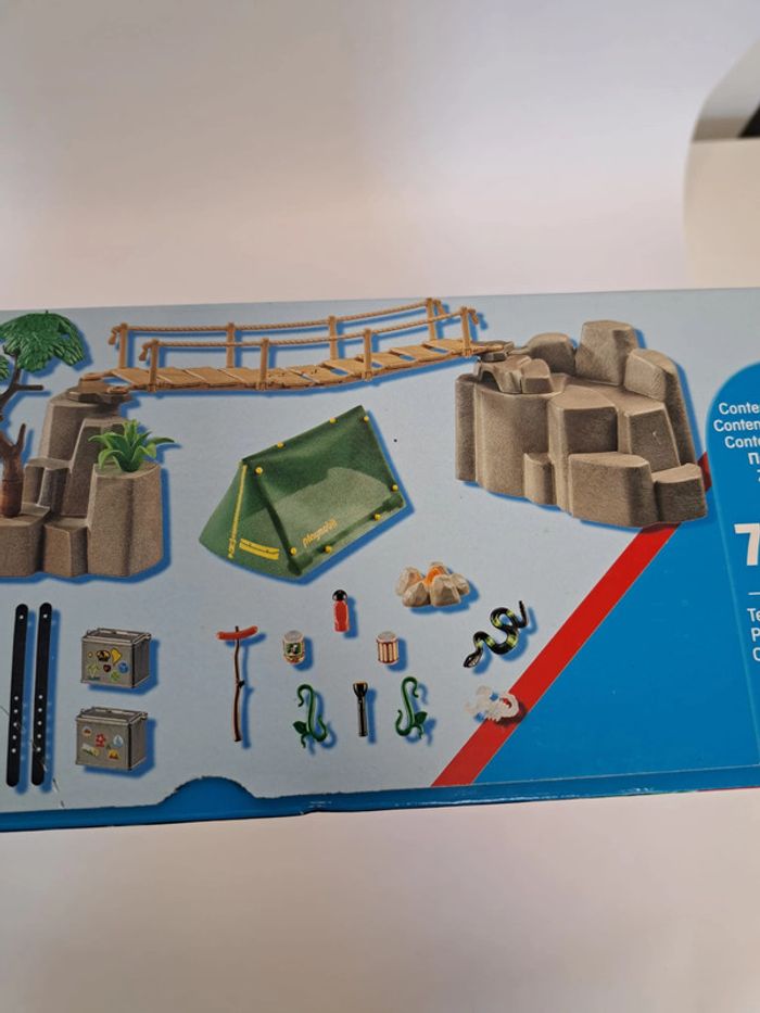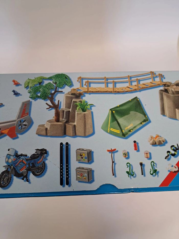 L'ensemble comprend trois figurines, un hélicoptère, un ours, une moto, une tente,
