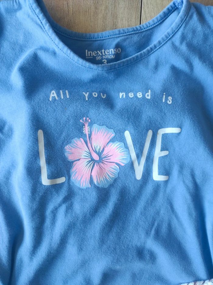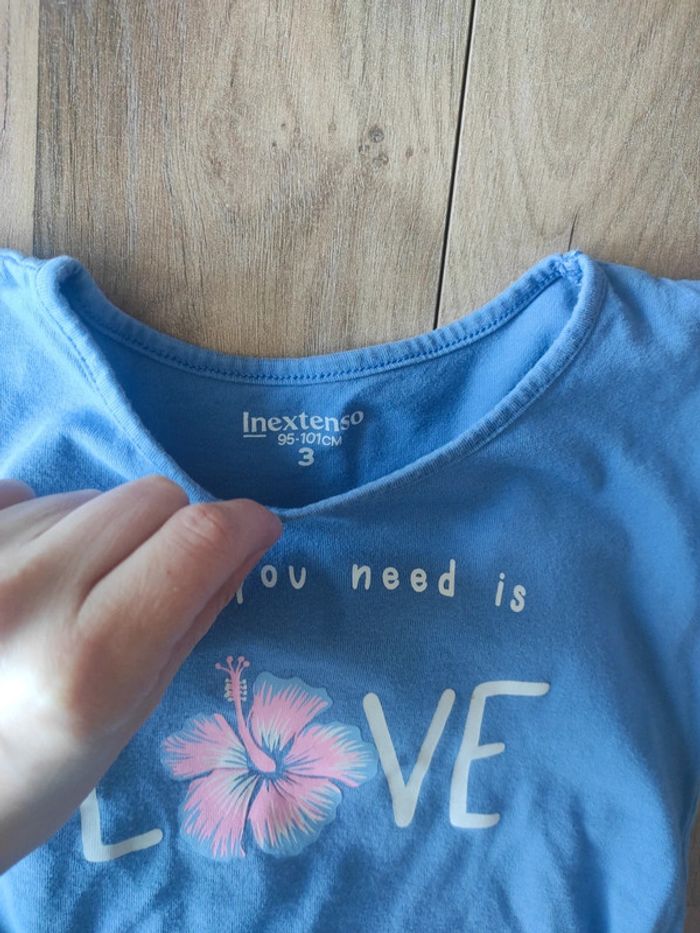 Tee-shirt 3 ans en très bon état et son legging (que je donne) car il comporte des trou et il est taché au genoux Mis en très bon état du fait que je DONNE le legging le prix est uniquement celui du tee-shirt #3ansmarygio59fille