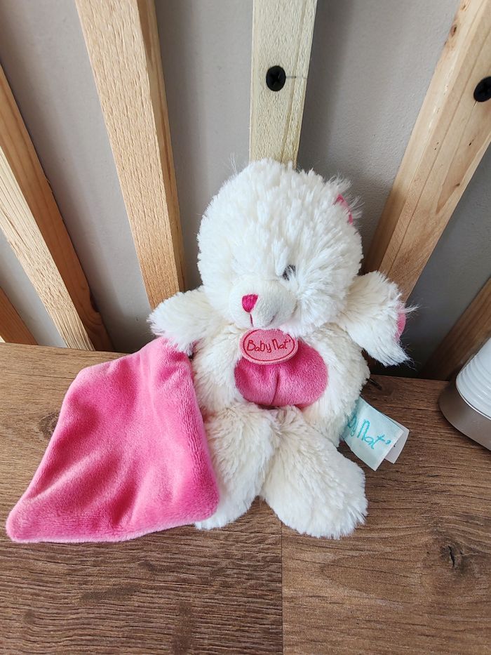 ours blanc rose fushia avec mouchoir rose fushia doudou peluche tous doux BABY NAT' mouchoir 18cm environ Tbe Étiquette marque présente 9.90 euros Envoi en relais