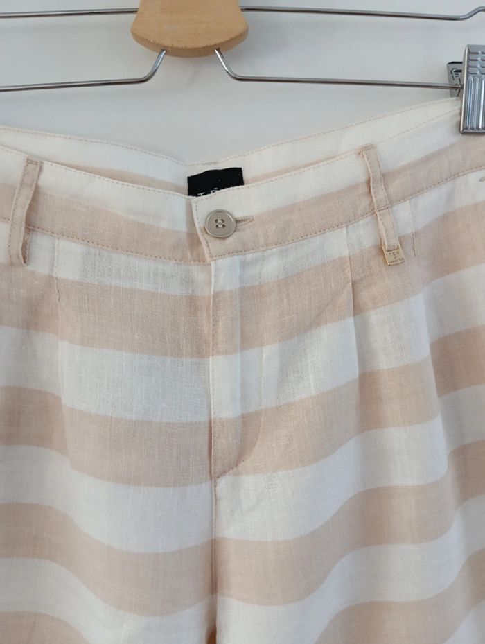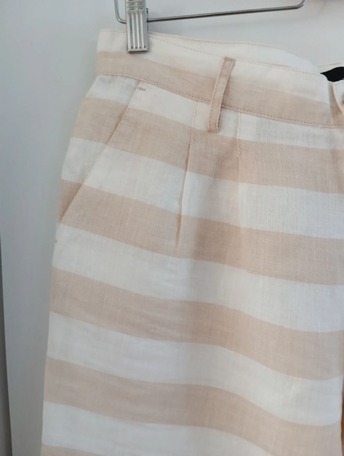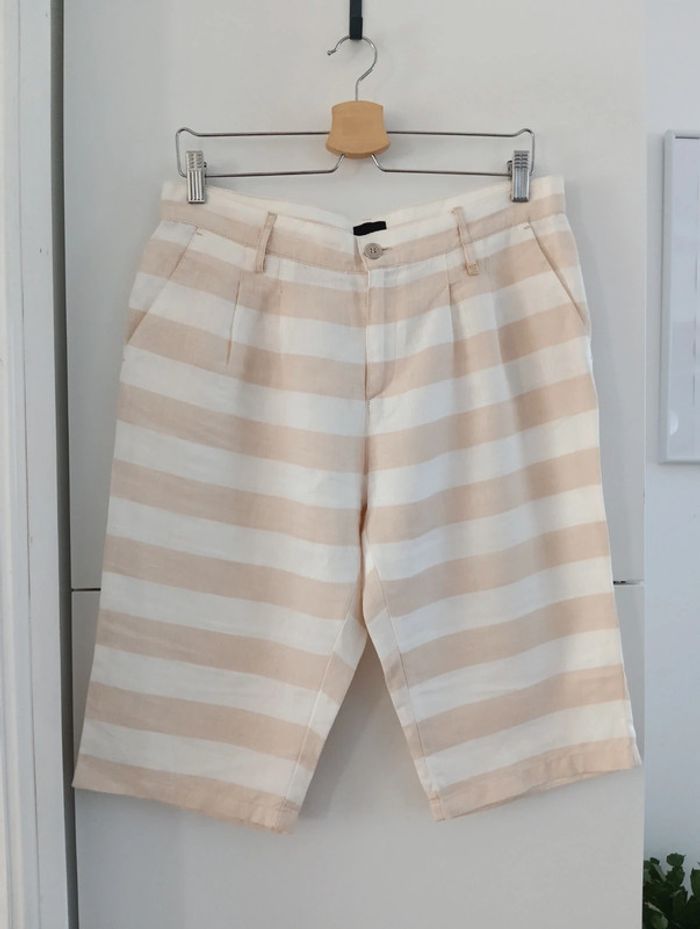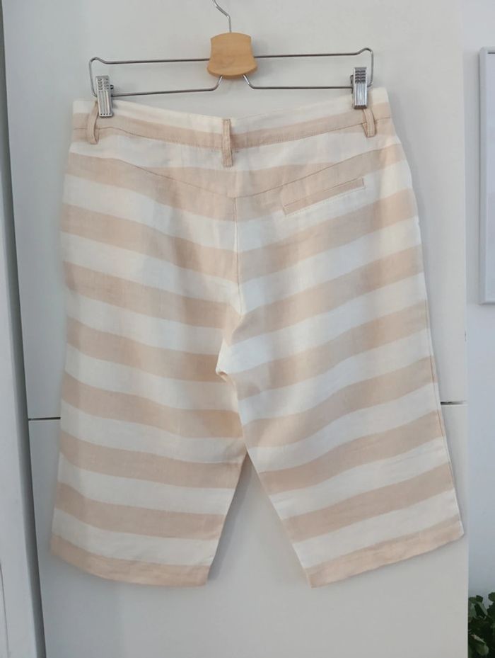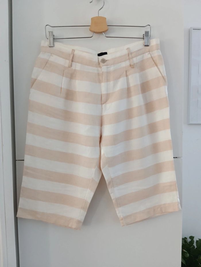 Bermuda en lin rayures beiges et écrues De la marque Ter de caractère Il n'y a plus d'étiquette de taille et de composition. Taille 40 estimée se référer aux mesures Mesures Taille 41 cm De la taille à l'entrejambe 27cm Longueur 59cm